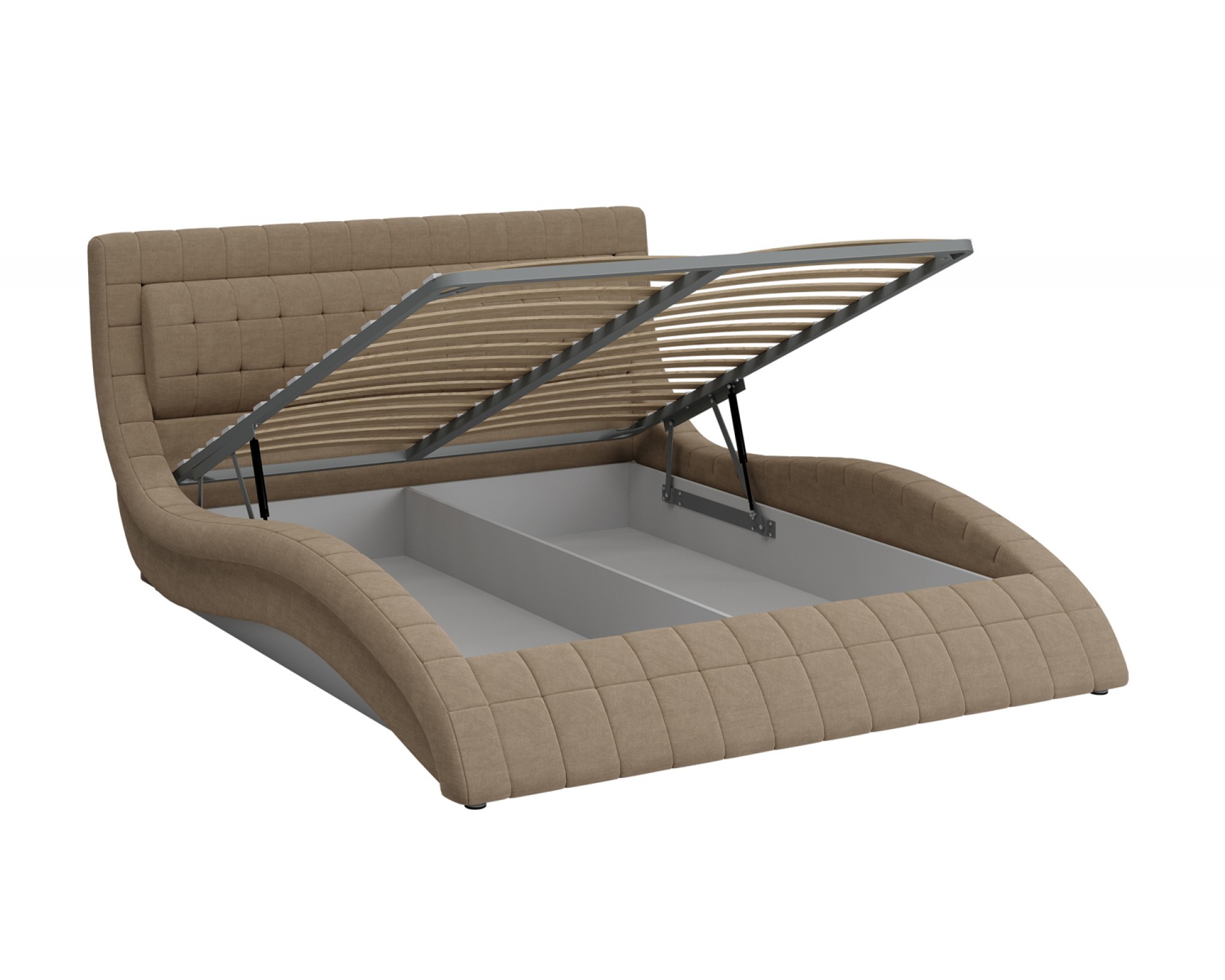 Интерьерная кровать Виргиния от фабрики мебели БРАВОмебель (РФ) может комплектоваться на Ваш выбор двумя вариантами ортопедического основания - металлокаркасом без подъемного механизма (вариант 1) или металлокаркасом с подъемным механизмом (газовым амортизатором (газлифтом)) и бельевым ящиком (вариант 2). В случае выбора 2-го варианта основания спального места в кровати будет находиться вместительный бельевой ящик.