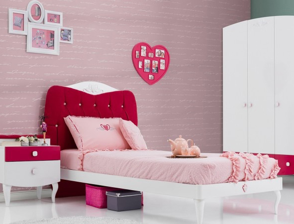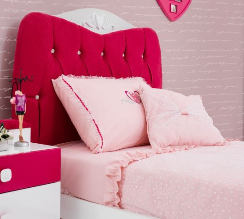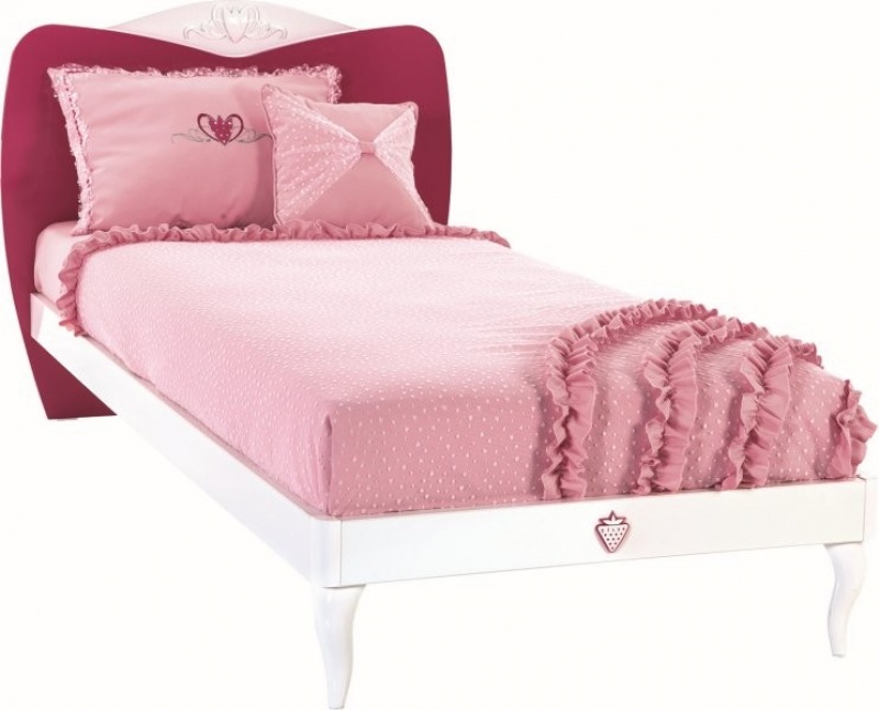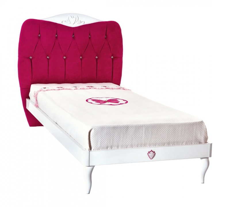 Односпальная кровать на изогнутых ножках в комнату для девочки. Каркас изготовлен из ДСП белого цвета и дополнен акцентным изголовьем, обитым тканью малинового цвета с легкой стяжкой и бусинами.