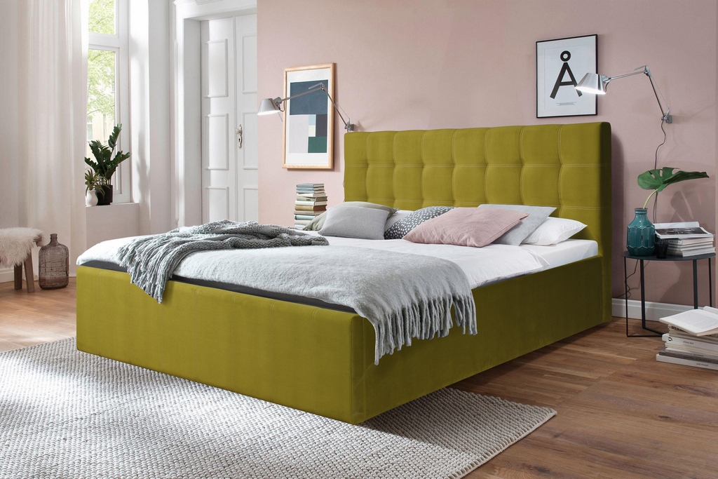 Кровать доступна для заказа в различных вариантах обивочной ткани.