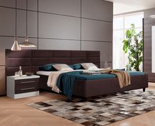 Трендовый дизайн с ровными объемными линиями на изголовье. Большой выбор тканей обивки.