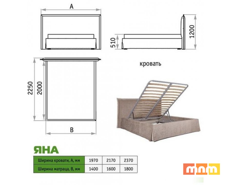 Спальное место (ДхШ): 200х120/140/160 см. Материал: МДФ, ЛДСП, фанера, ткань.