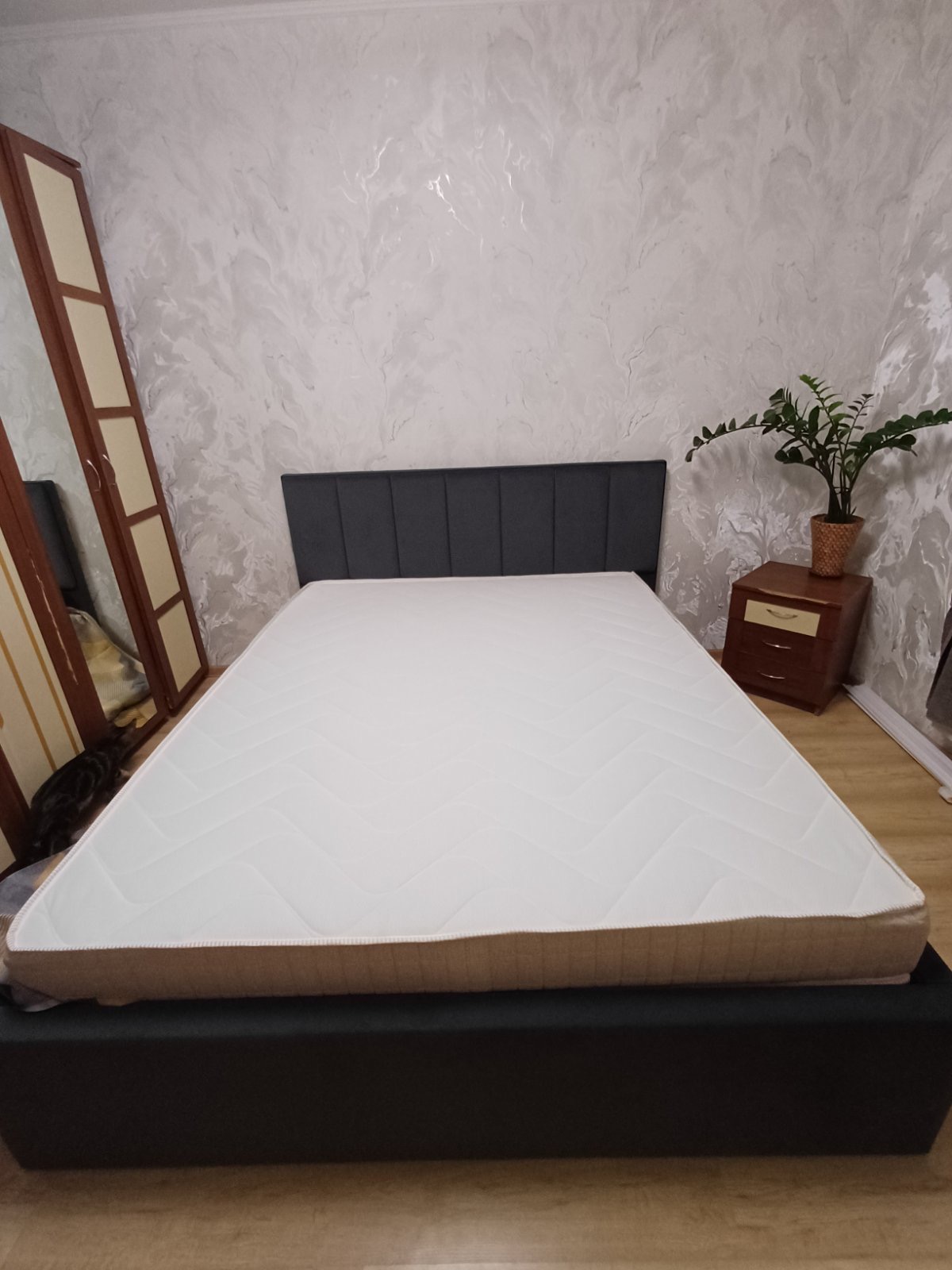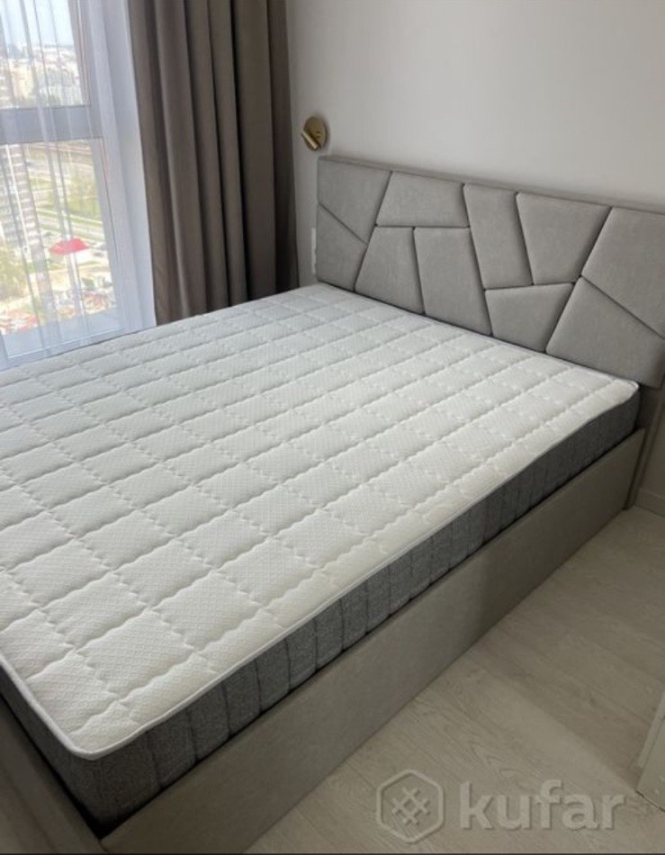 Современная двуспальная кровать с ортопедическим основанием и мягким изголовьем.