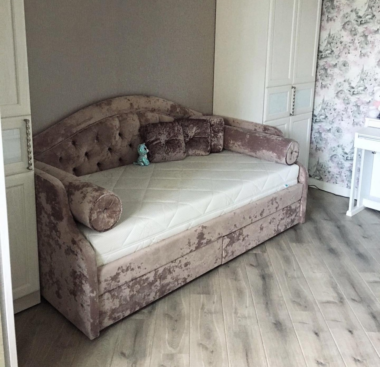 Спальное место: 160x200 см. Материал: шпон, вельвет.