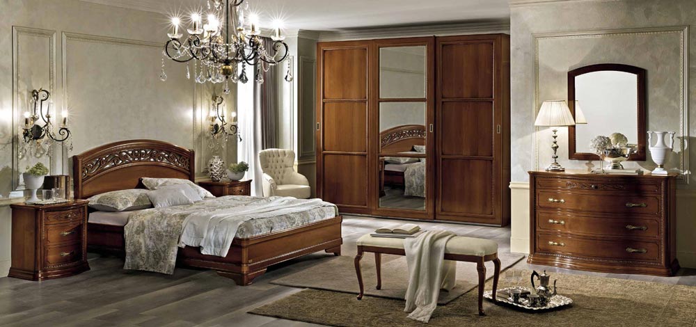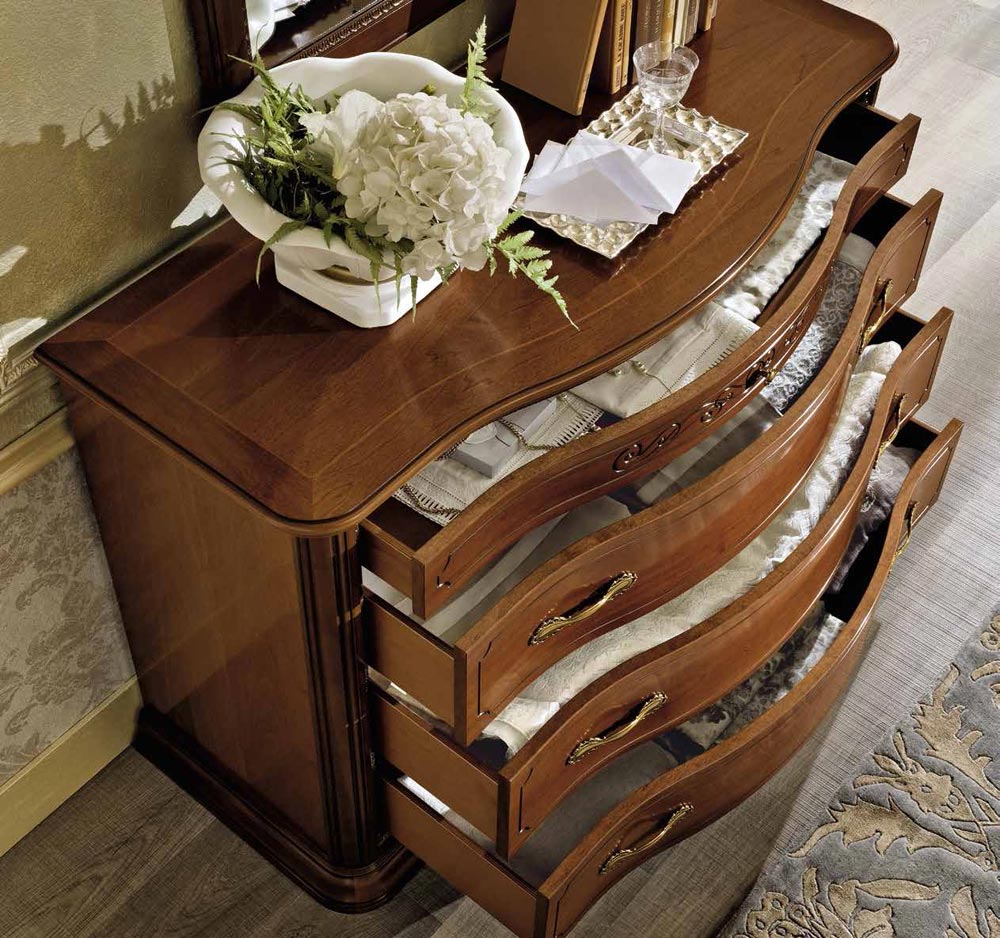 Спальня Торриани представлена в варианте VIP для особо требовательных клиентов, которые ценят уникальность в деталях и классические, элегантные линии. Фасады прикроватных тумб и комодов отличаются изогнутыми линиями “волна” с резьбой, которые повторяют дизайн ковки на изголовьях кроватей. Столешницы из дерева повторяют линии изогнутых фасадов и подчеркивают оригинальность и ценность ручной работы. Массив дерева, шпон ореха и липа.
