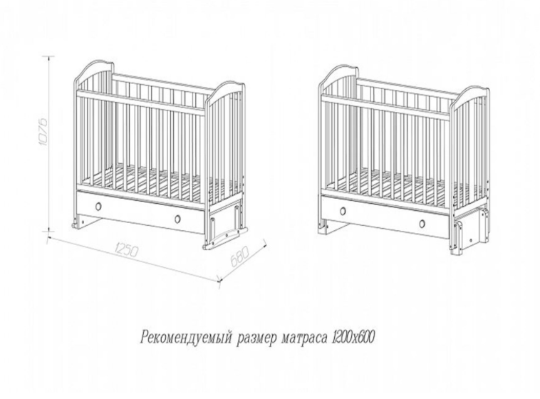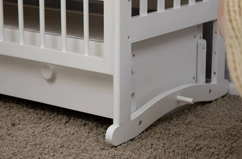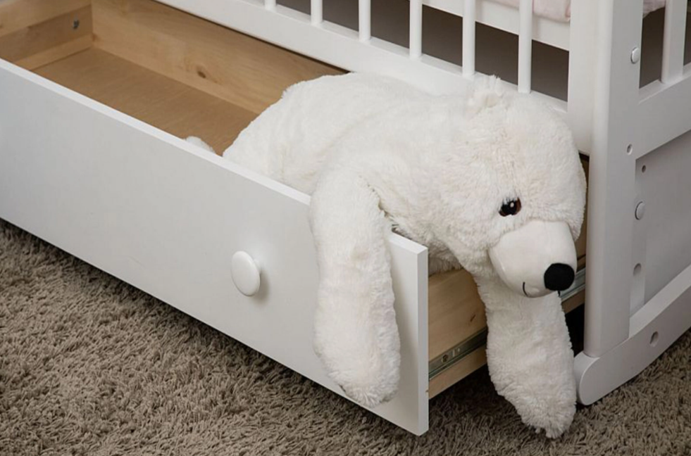 - Кроватка имеет удобный и практичный ящик для хранения предметов, необходимых для ухода за ребенком.