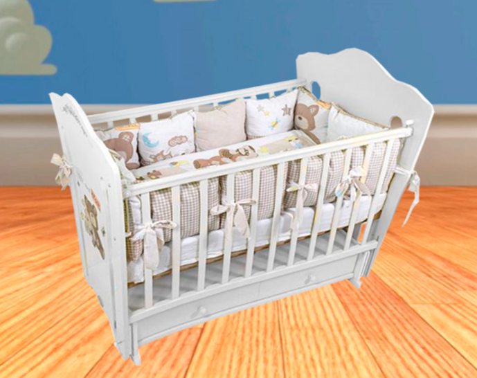 Детская кроватка HAPPY STORY с поперечным маятником – классической формы и с уникальным принтом. Очаровательные медвежонок и зайка в обнимку добавят интерьеру нежности и тепла. Спинки кроватки – закрытые, с 2-мя вырезами по бокам и витиеватым узором сверху. Визуально они напоминают трон и придают кроватке аристократический внешний вид.