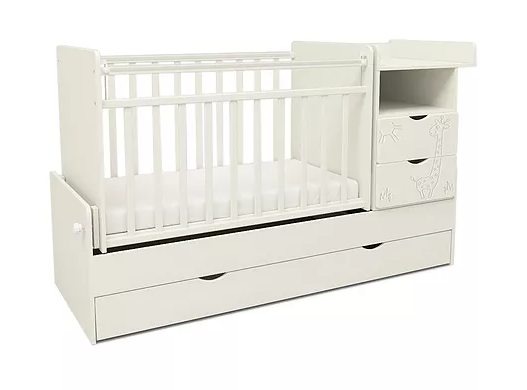 Два фасада ящиков комода из МДФ, облицованные плёнкой ПВХ, с забавной фрезеровкой в виде жирафа. Пеленальный стол с ограждениями стал гораздо удобнее, за счёт увеличения размера столешницы