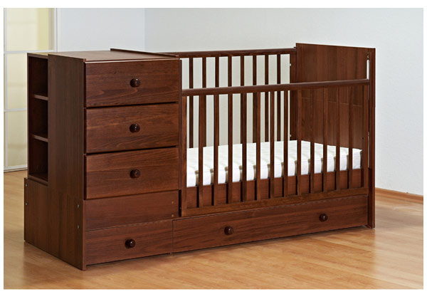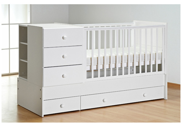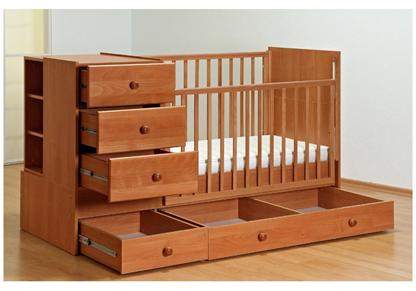 Модель снабжена огромным количеством ящиков и полочек, куда можно слаживать игрушки или белье. Стоит также отметить одну из главных особенностей кроватки – наличие двух уровней положения матрасика.