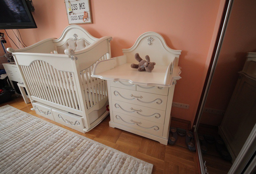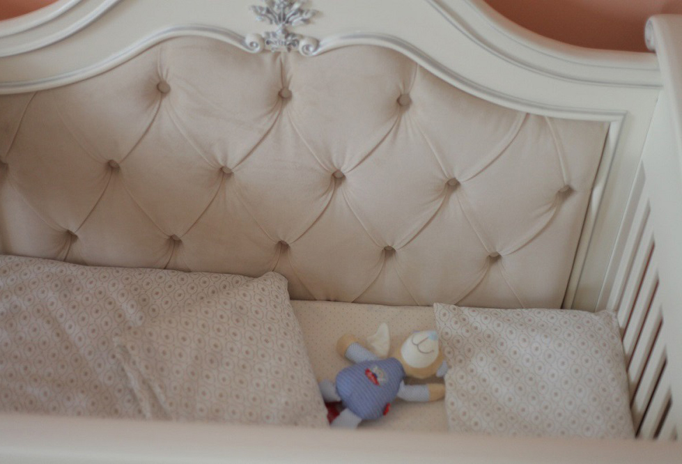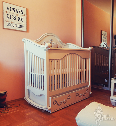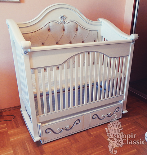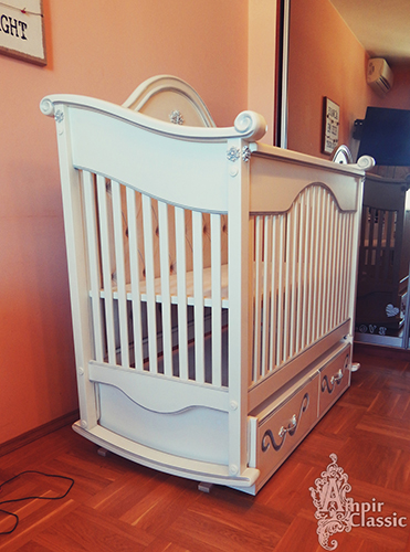 При изготовлении кроватки из массива, использовались только качественные материалы, благодаря чему эта мебель экологически чистая и безопасная для детей. Кроватка для новорожденных оборудована двумя вместительными ящиками для белья, полозьями для качания. Кроватка может трансформироватьсяв одноместную детскую кровать. Изголовье кровати декорировано каретной стяжкой.