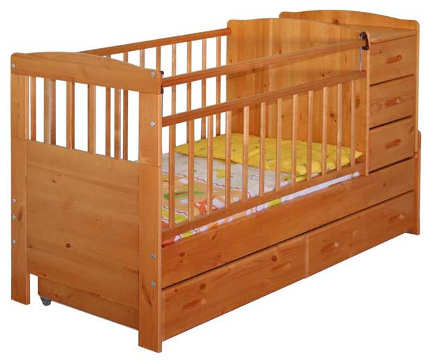 Кроватка создана при использовании натуральной древесины, покрытой лаками, абсолютно безопасными для здоровья детей. В конструкции Велар М10 предусмотрено множество функциональных предметов, которые обеспечат вам полный комплекс всего необходимого для эффективного ухода за малышом. Так, например, вместе с кроваткой Велар М10 родители получат ещё и удобный пеленальный столик, расположенный возле кроватки. Его можно легко убрать, как только малыш подрастёт и перестанет нуждаться в частом пеленании. Кроме того, под пеленальным столиком располагаются три выдвижных ящика для разнообразных детских принадлежностей.