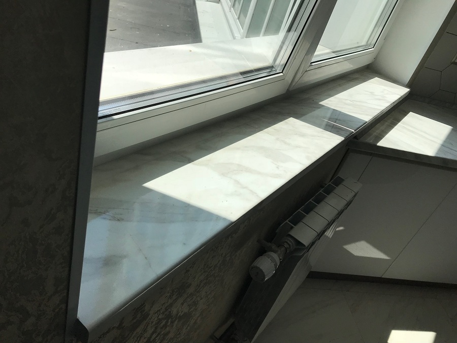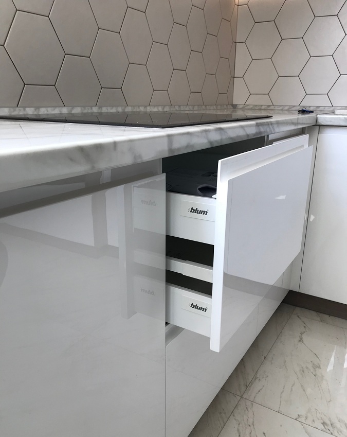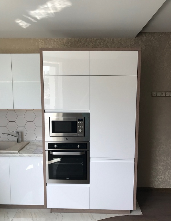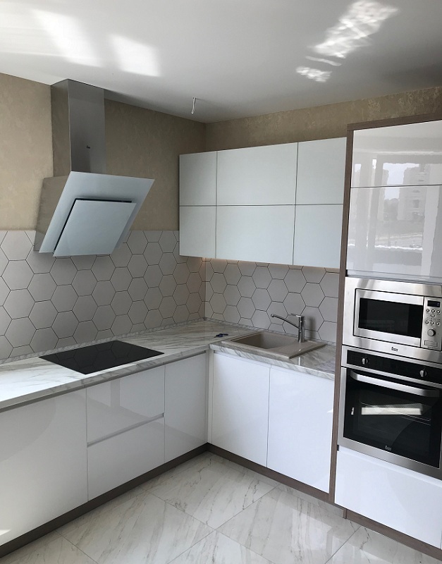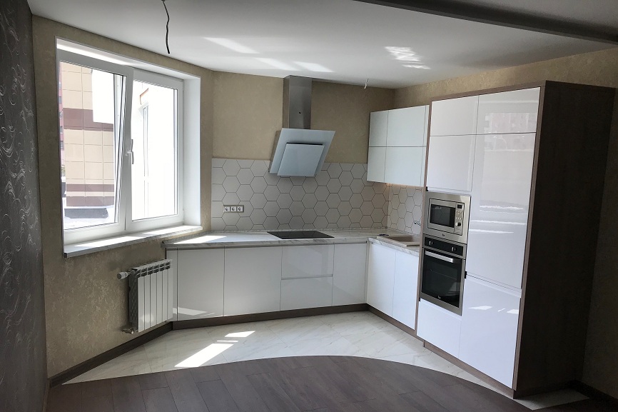 Кухня угловая с глянцевыми фасадами белого цвета и мраморным постформингом, а также индивидуальным диагональным шкафчиком под помещение нестандартной планировки. Шкаф для встроенной духовой печи и холодильника.