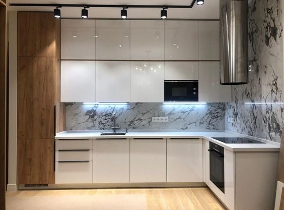 - Белые глянцевые фасады: придают интерьеру элегантность и современность, визуально увеличивая пространство и делая его светлее.