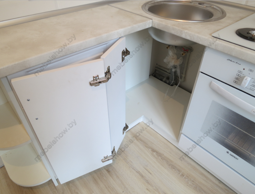 Угловая кухня с белыми вместительными фасадами. Изготовлена из качественных и долговечным материалов.