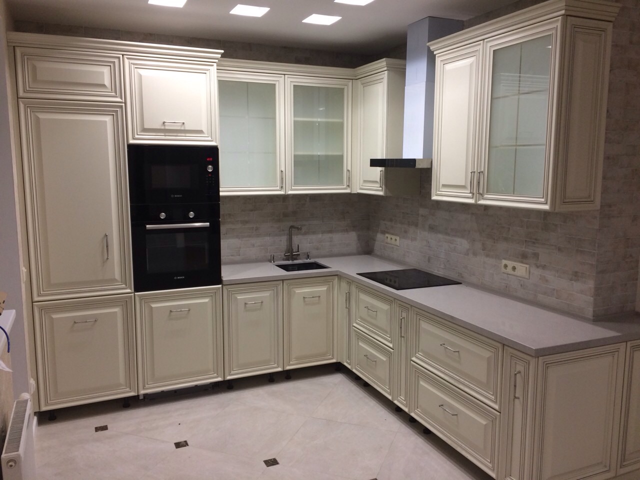 Кухня выполнена из крашенного в белый матовый цвет массива дерева, дополнена резными элементами в виде карнизов и прямоугольных филенок. Навесные модули оформлены стеклянными витринами в пескоструйной обработке сетчатым рисунком, имитирующим оконные шпроссы. Столешница изготовлена в популярном цвете серый бетон. В буфете имеются ниши для встроенного холодильника и духового шкафа.