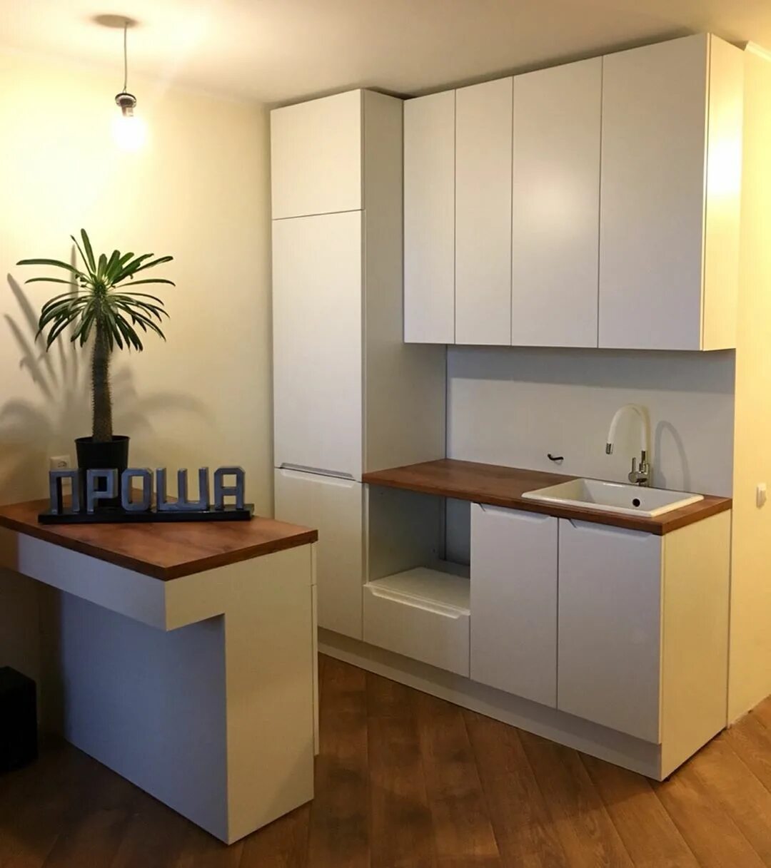 Фасады без ручек. Столешница и фартук в едином стиле. Удобное рабочее пространство.