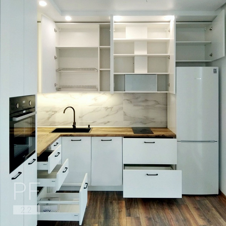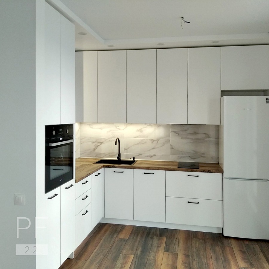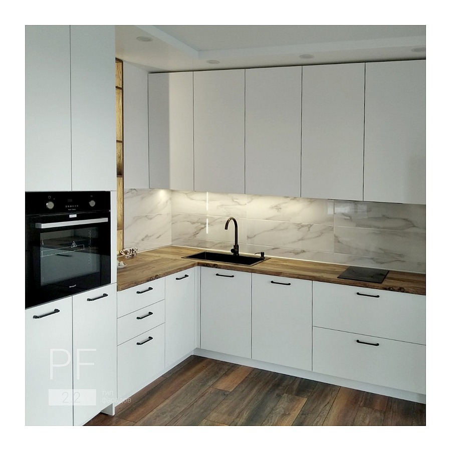 Белые матовые фасады из акрила. Фурнитура: Blum (Австрия).
