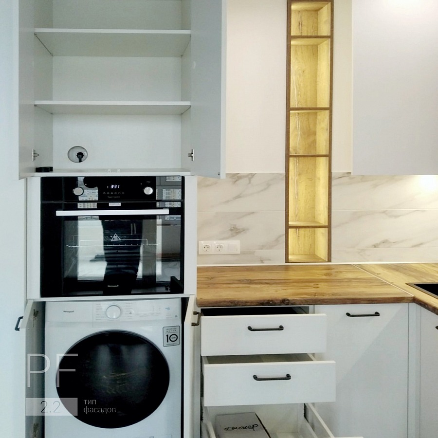 Стиральная машина расположена под духовым шкафом, что позволяет сэкономить пространство на кухне.