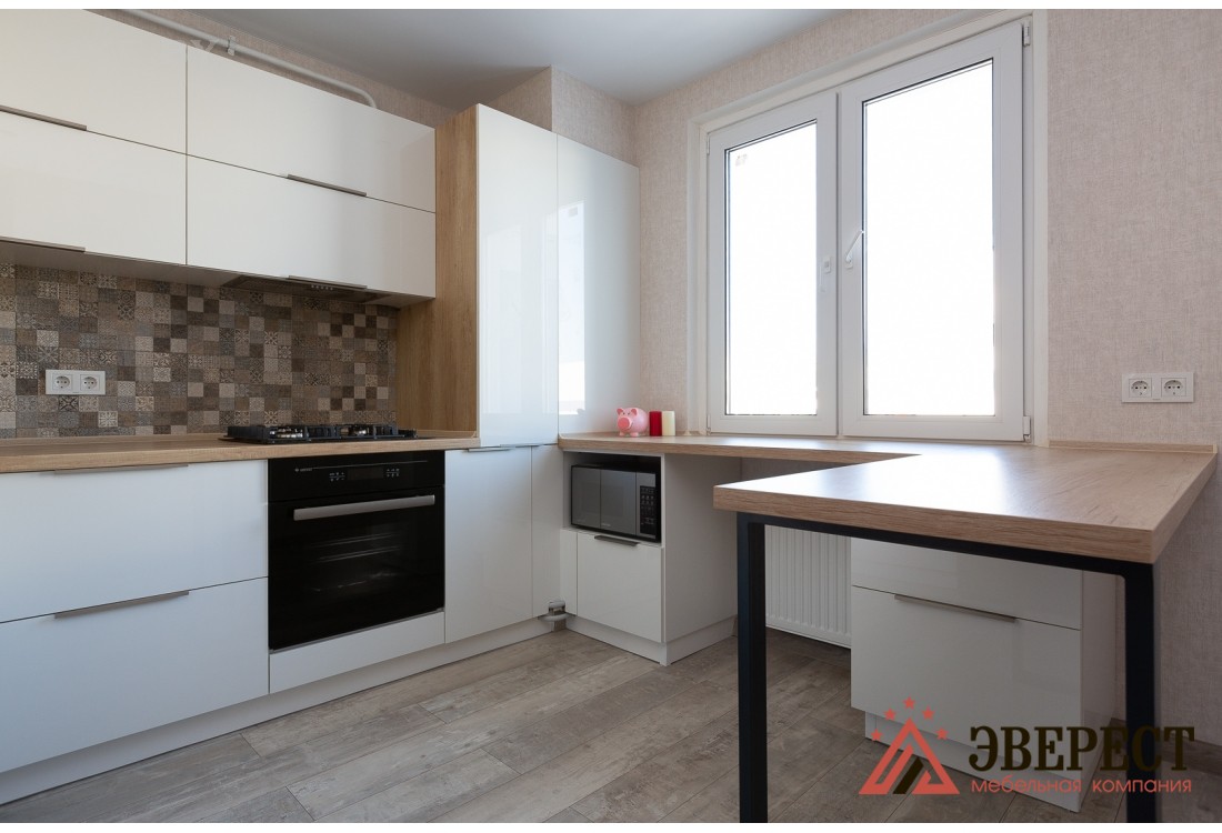 Оригинальная модель кухни с вместительными фасадами изготовлена из акрила. Акриловые кухни способны выдержать сильные механический воздействия и без последствий переносить высокую температуру, материал обладает защитой от трещин и царапин. Кухня оснащена нишами для плиты и духового шкафа. Конструкция кухни удобно совмещена с обеденной зоной.