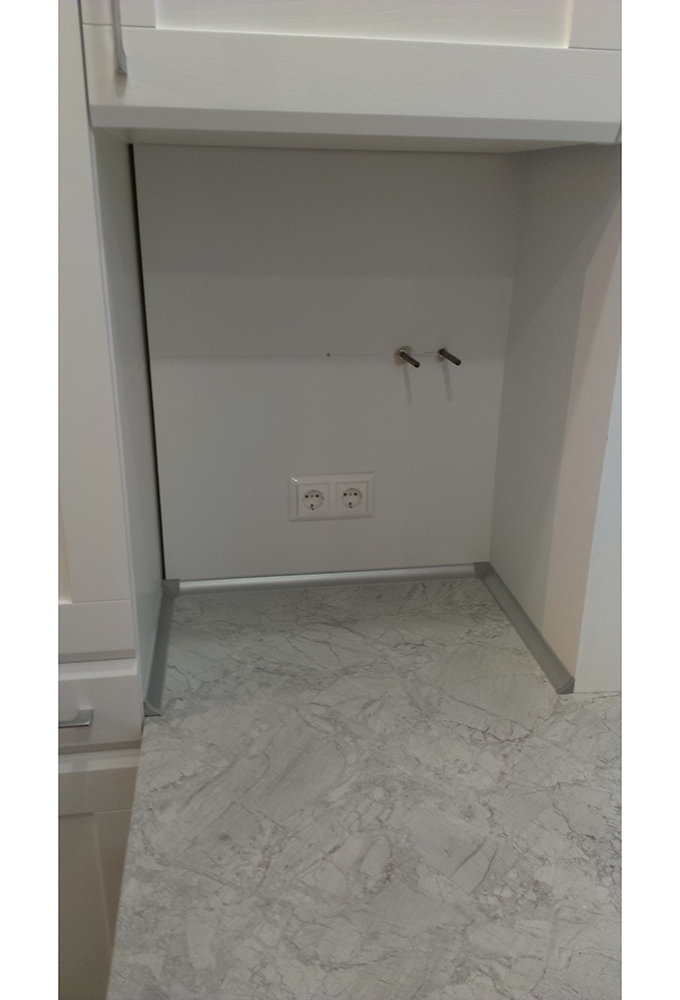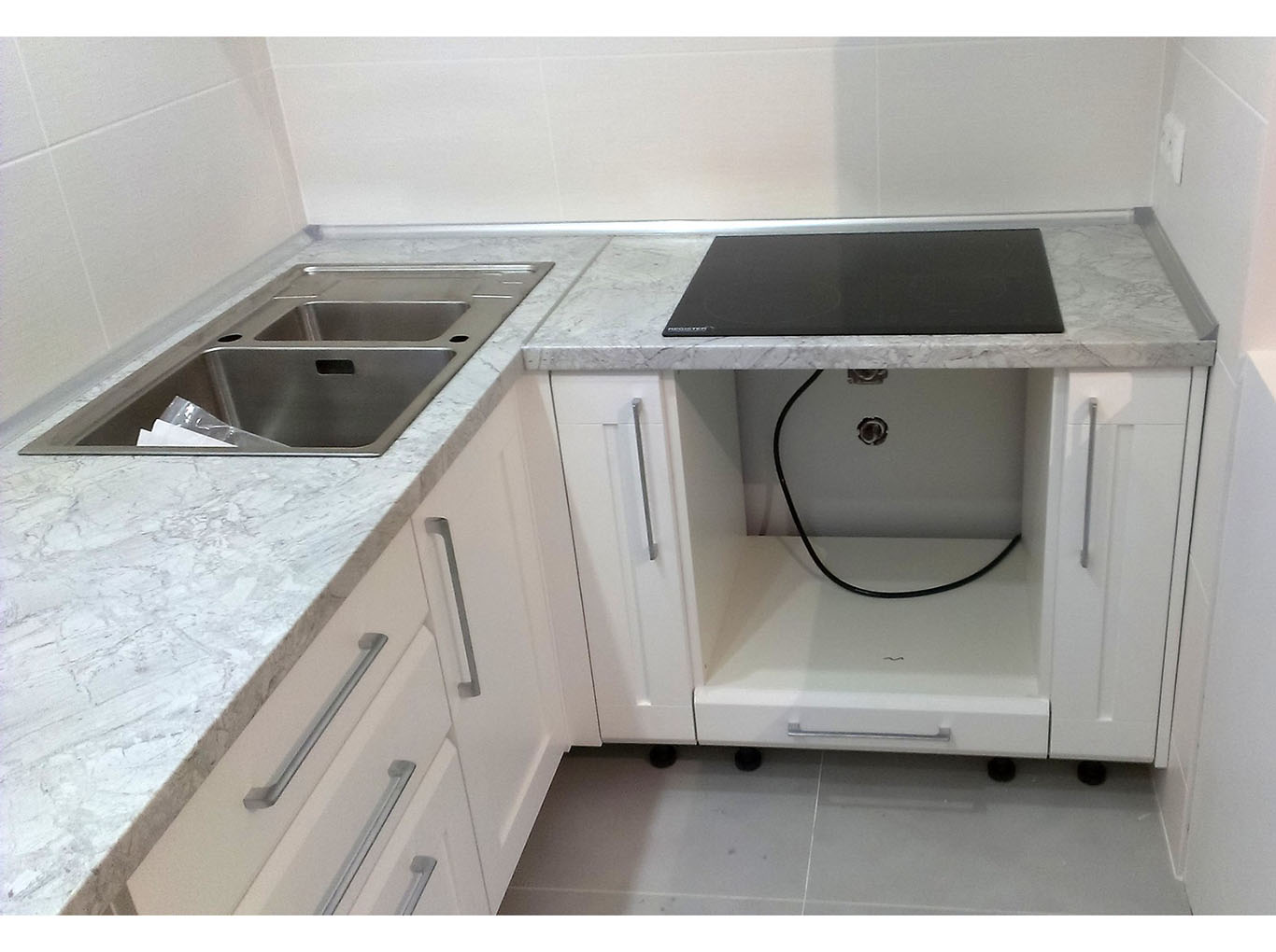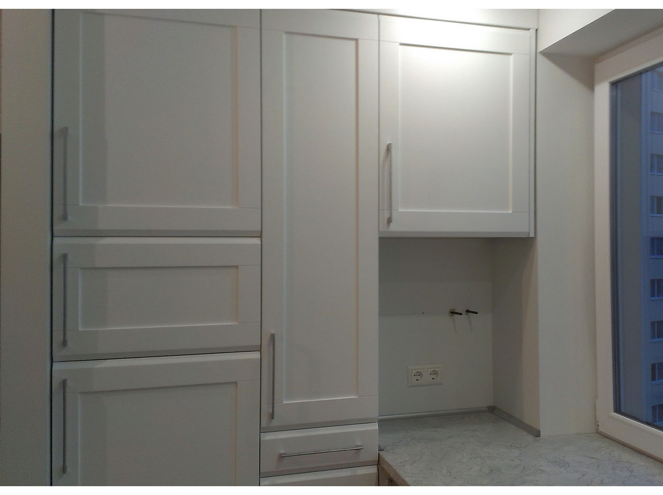 Белая угловая кухня отличается лаконичным дизайном, с использованием традиционной фурнитуры в виде металлических ручек-скоб. Просторная и удобная столешница под мрамор, а также множество ящиков и шкафчиков для кухонной утвари поспособствуют увлекательному кулинарному процессу. В модели предусмотрен модуль для встраиваемой техники.