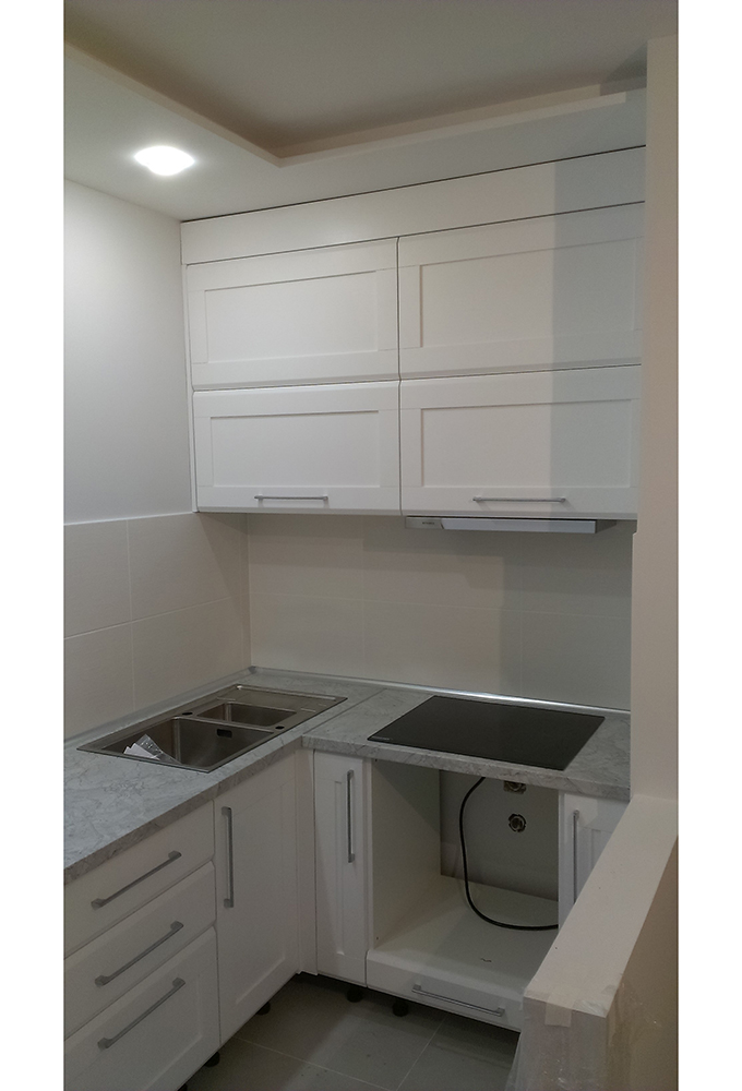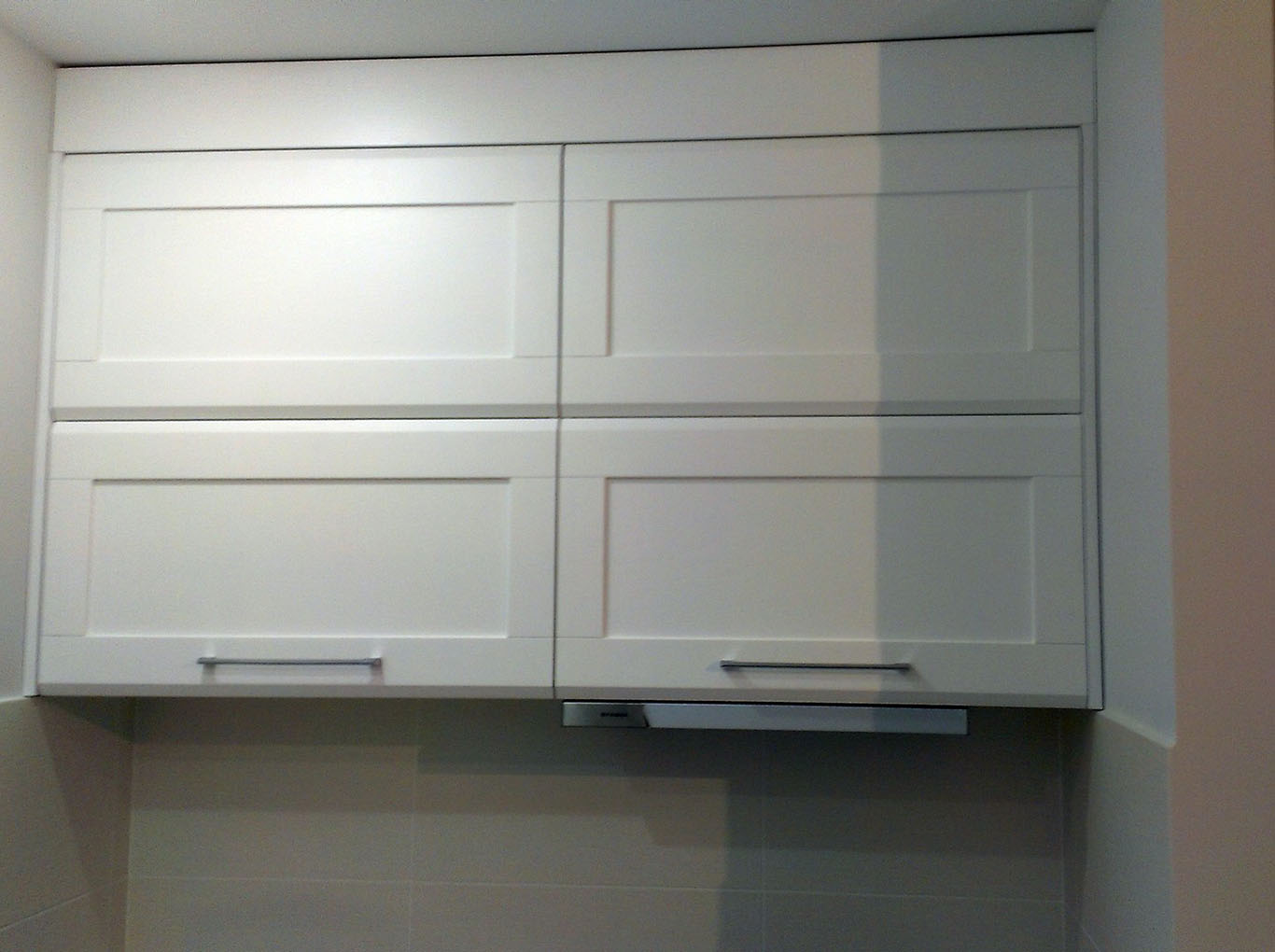 Глубина навесных шкафов 30 см. Удобные металлические ручки.