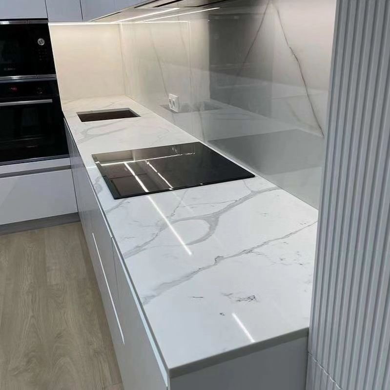 Угловая белая кухня с черной столешницей и обеденной зоной