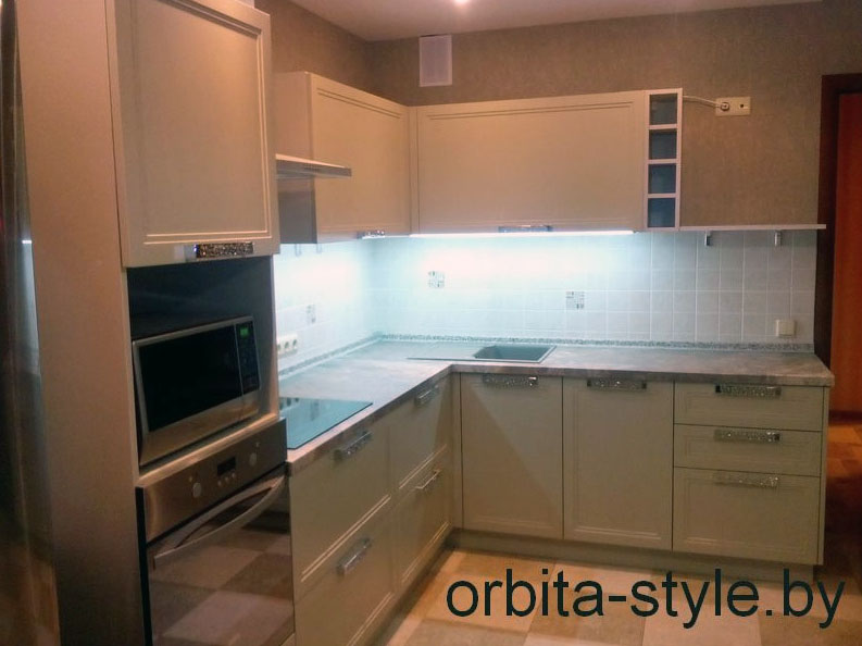 Фасады с фрезеровкой, витражная вставка. Ширина кухни 180 см.