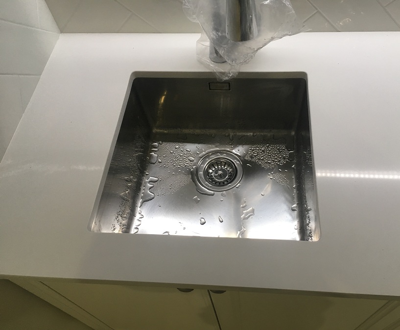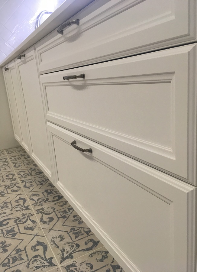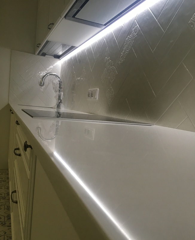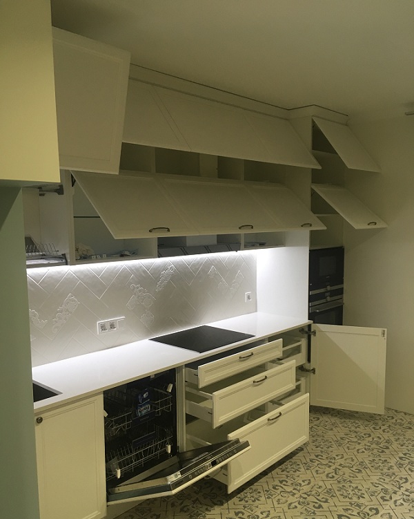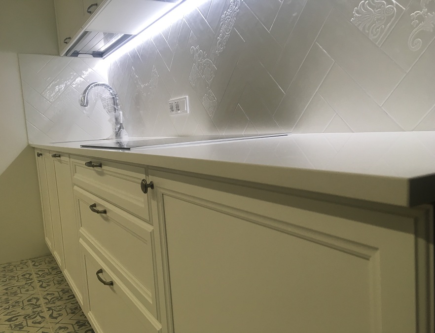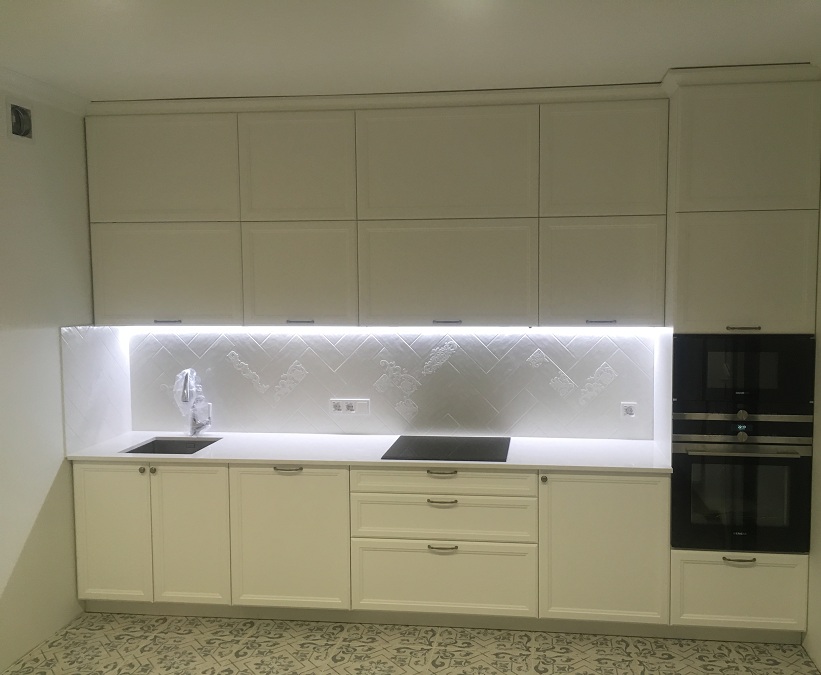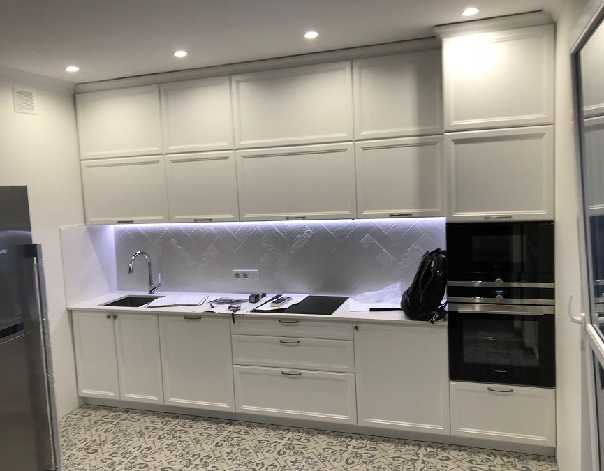 Кухня линейная с крашенными фасадами белого матового цвета со столешницей из искусственного камня толщиной 19мм и фурнитурой Blum.
