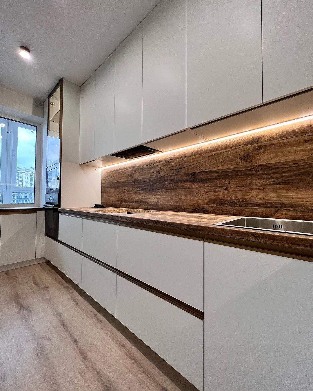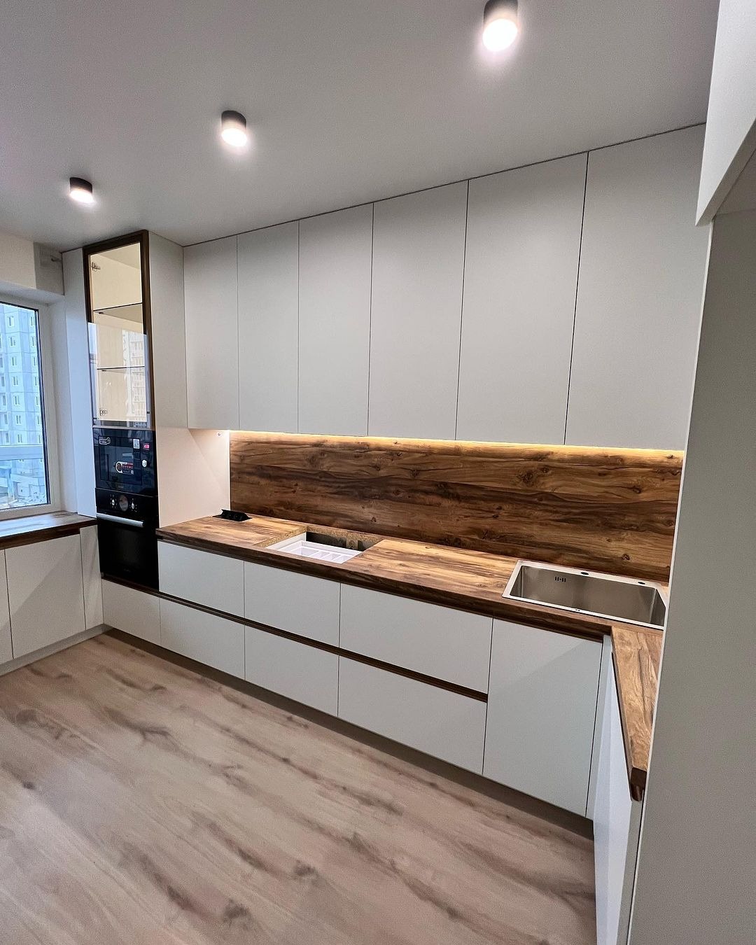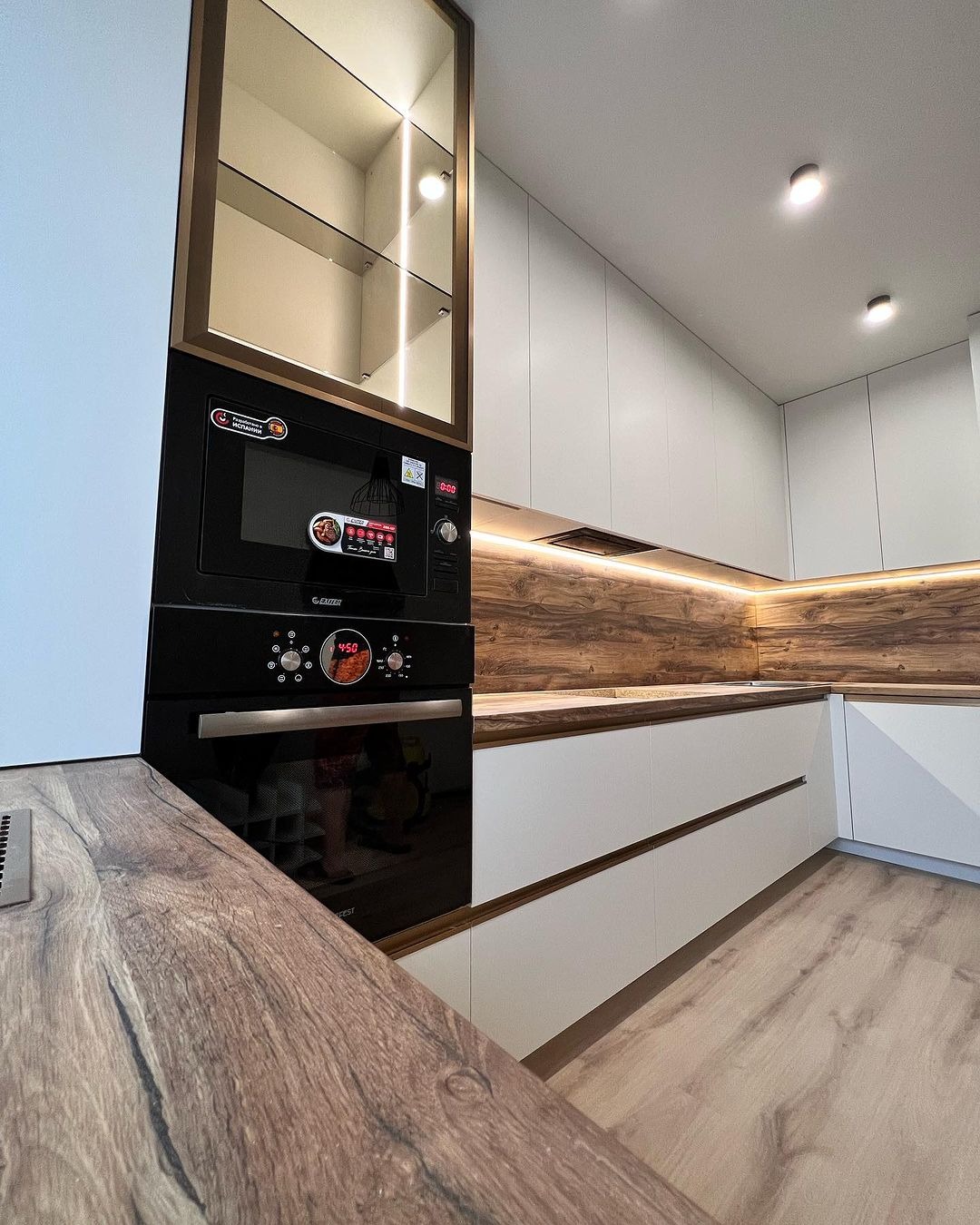 Минималистичная кухня от фабрики ЗОВ с комбинированными фасадами из шпона и пластика.