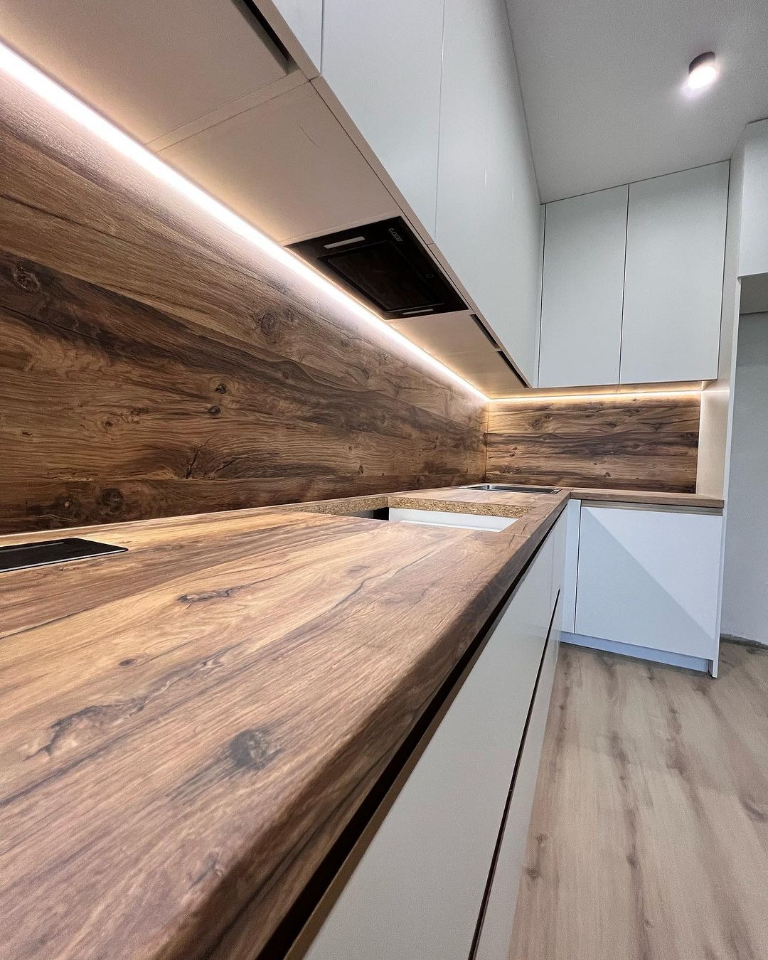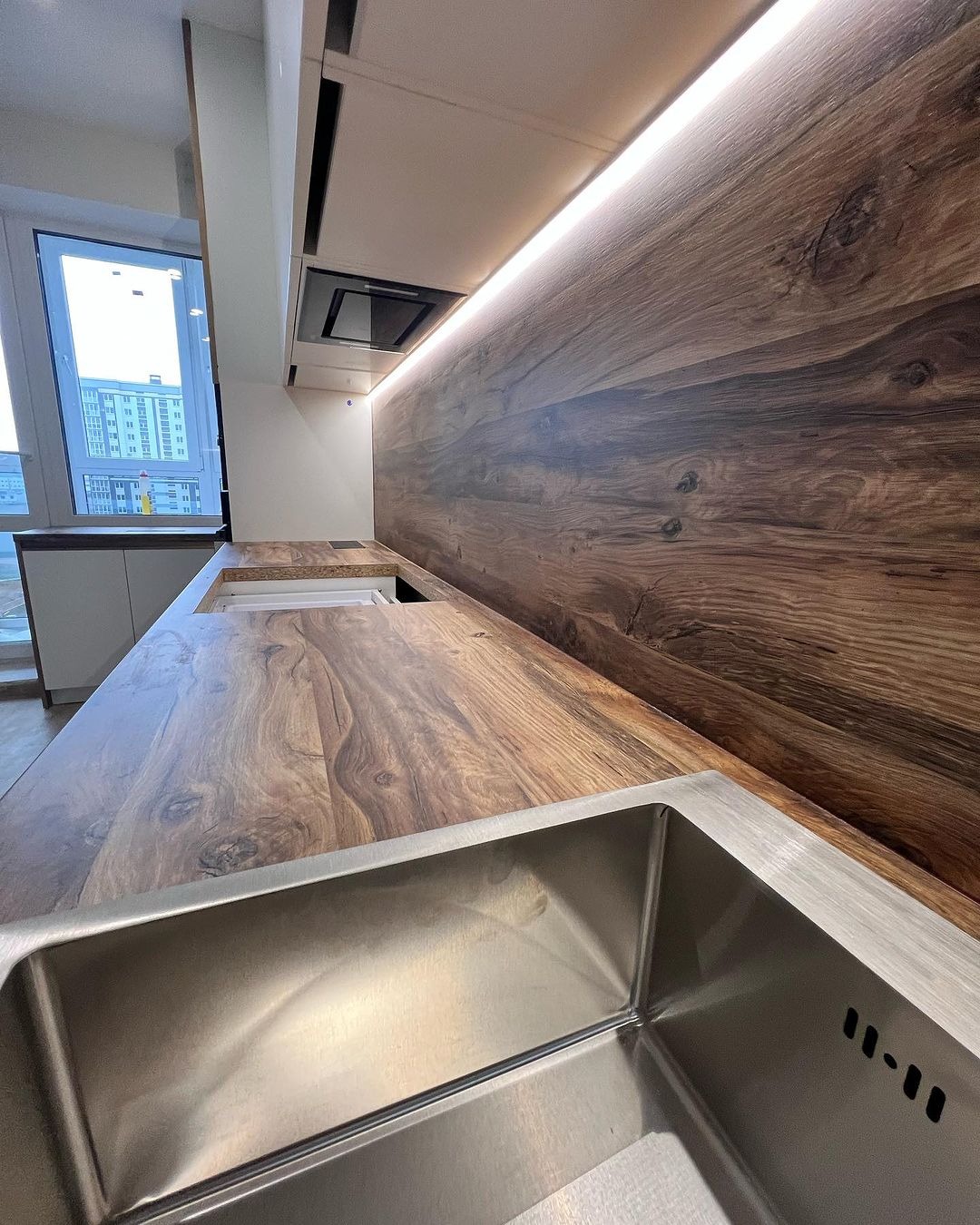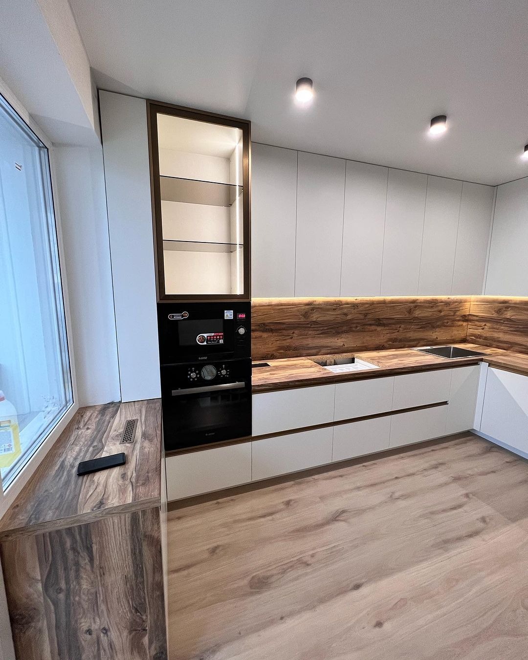 Минималистичная кухня от фабрики ЗОВ с комбинированными фасадами из шпона и пластика.