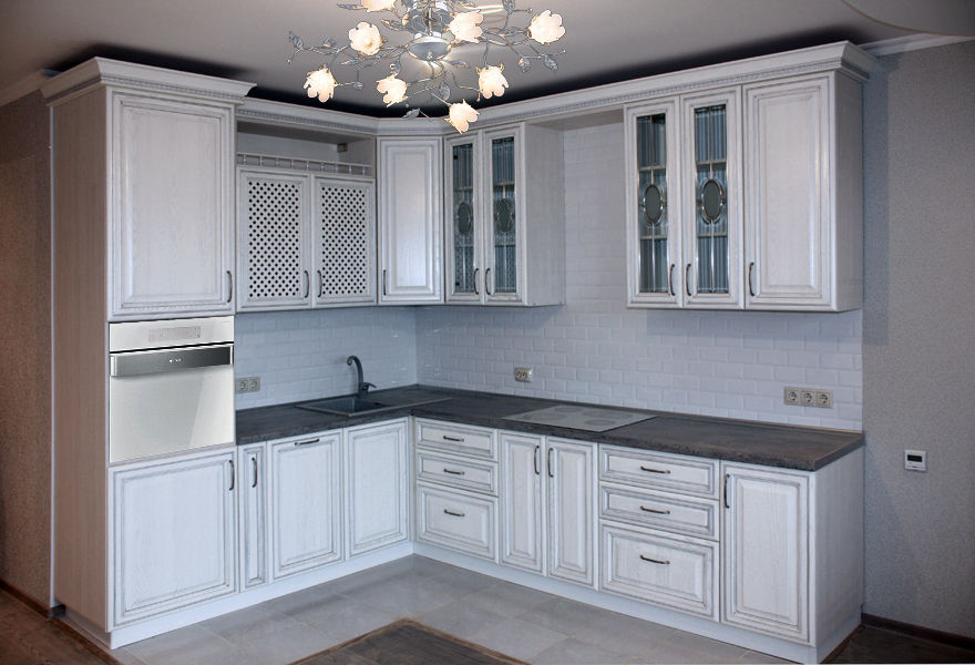 Изящная белая кухня выполнена в белом цвете с применением качественной фрезеровки, и декорирована стильными филенками. Оригинальные витражные стекла придадут кухонному гарнитуру яркий колорит. Ящики и шкафчики симметричны, с темными дугообразными ручками. Темная столешница удачно контрастирует с приятными фасадами белого цвета.
