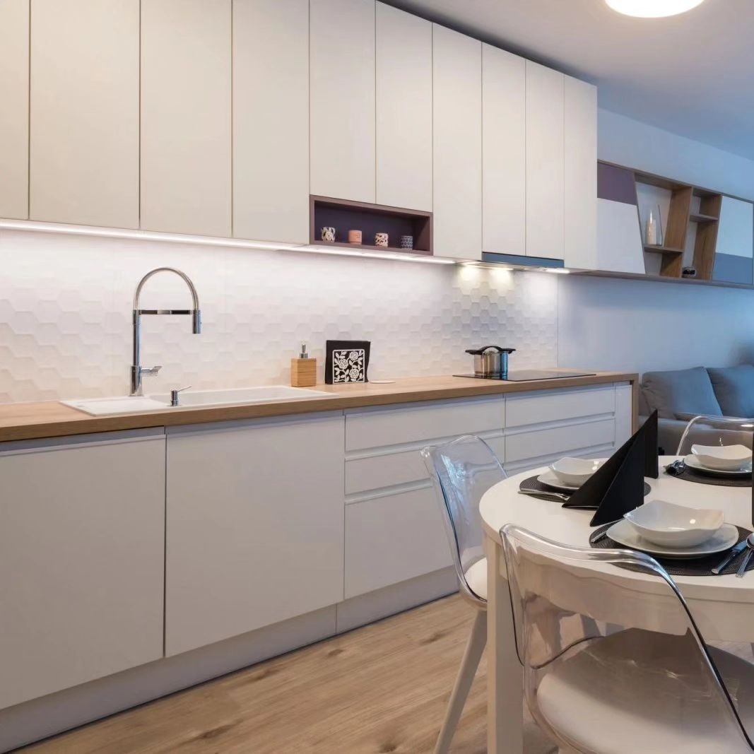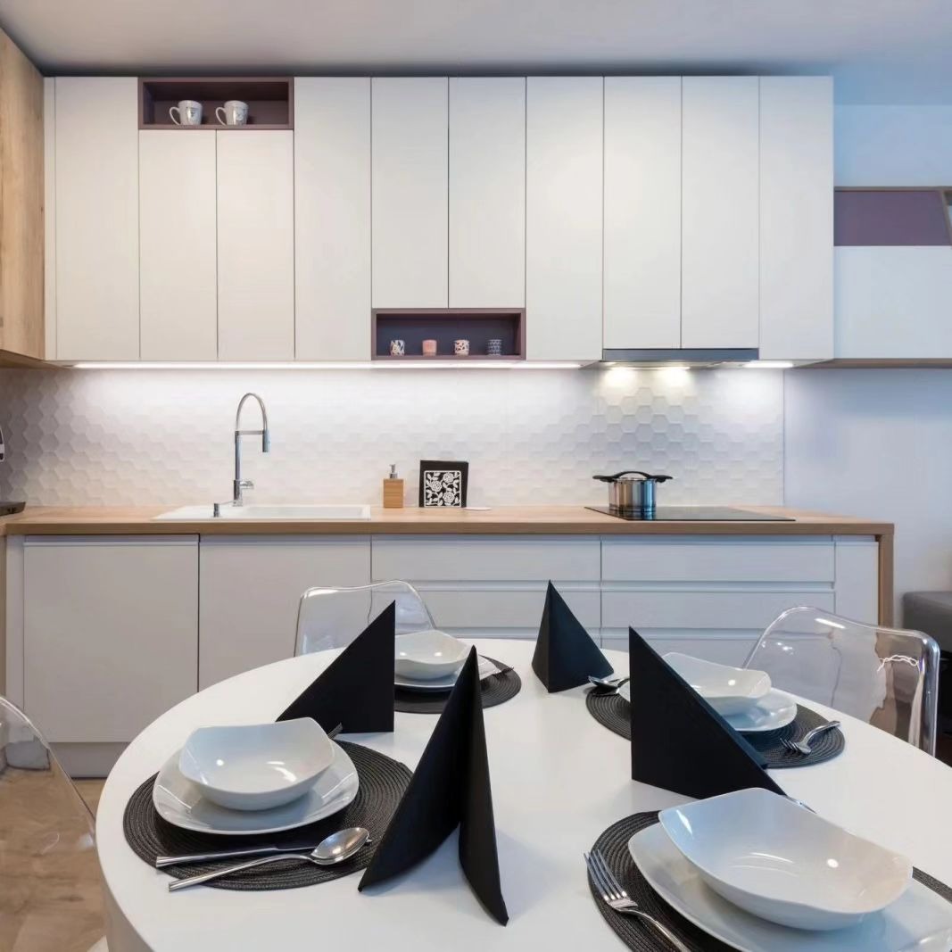 Современные кухни из МДФ и ЛДСП, пластика, металла, закаленного стекла.