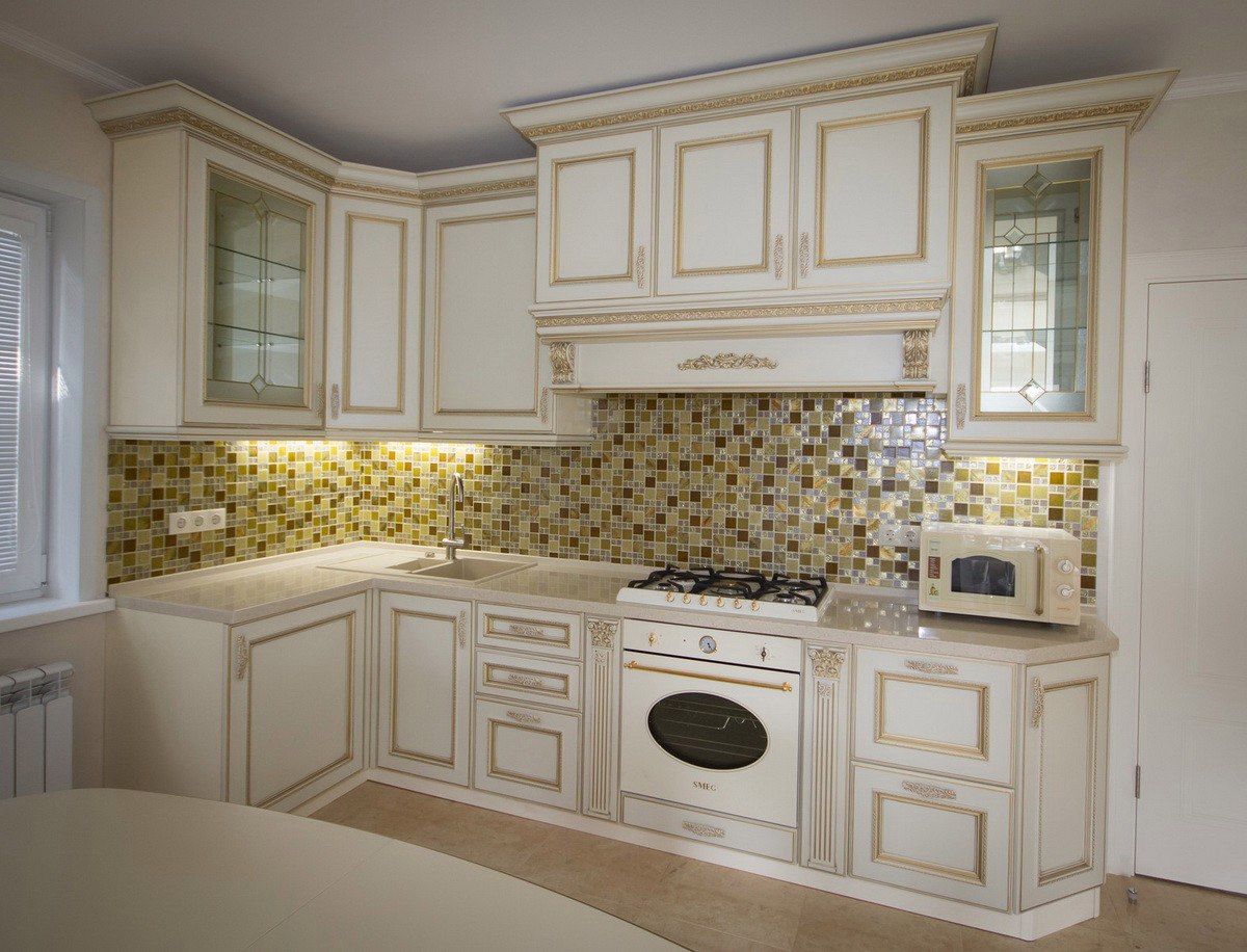 Необычная кухня с роскошным декором. Белые матовые фасады в филенках и резьбе, с витражным остеклением торцевых шкафчиков верха. Фасад над плитой слегка выступает над общим фоном.