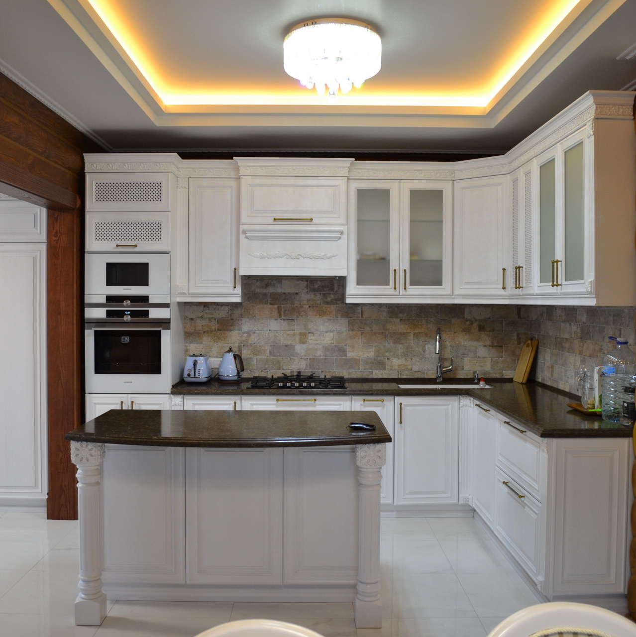 Современная кухня из МДФ. Удлиненные верхние шкафы.