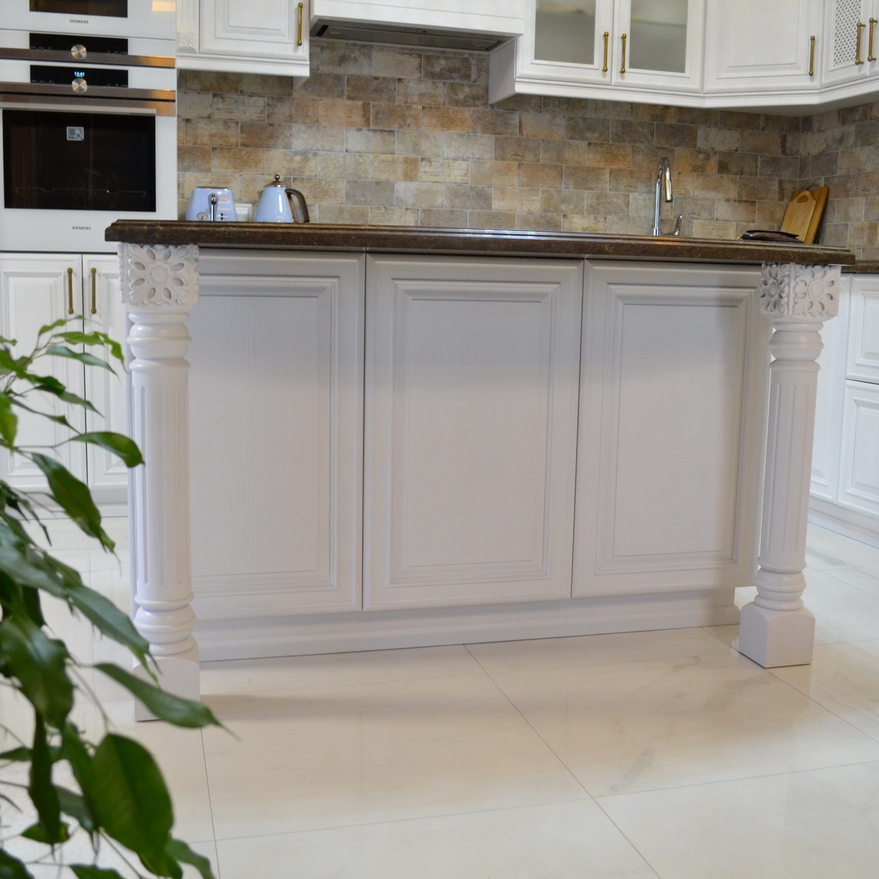 Белые матовые фасады с филенками и прямоугольными ручками.
