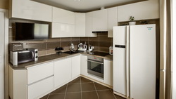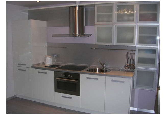 Белая линейная кухня оснащена шкафчиками, дверцы которых выполнены из лакомата. Шкафчики предназначены для размещения в них посуды и других принадлежностей. Преимуществом лакомата является его долговечность, а также отсутствие отпечатков пальцев на стекле. Кухня выполнена со строгими прямоугольными формами комплектующих. На столешнице присутствует отверстие под врезную раковину.