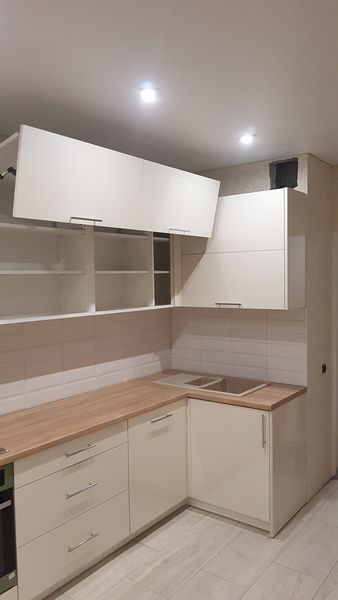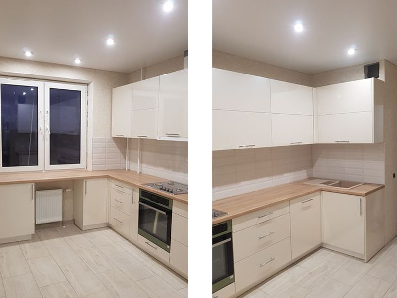 Современный кухонный гарнитур из крашенного МДФ. Вместительные шкафчики.