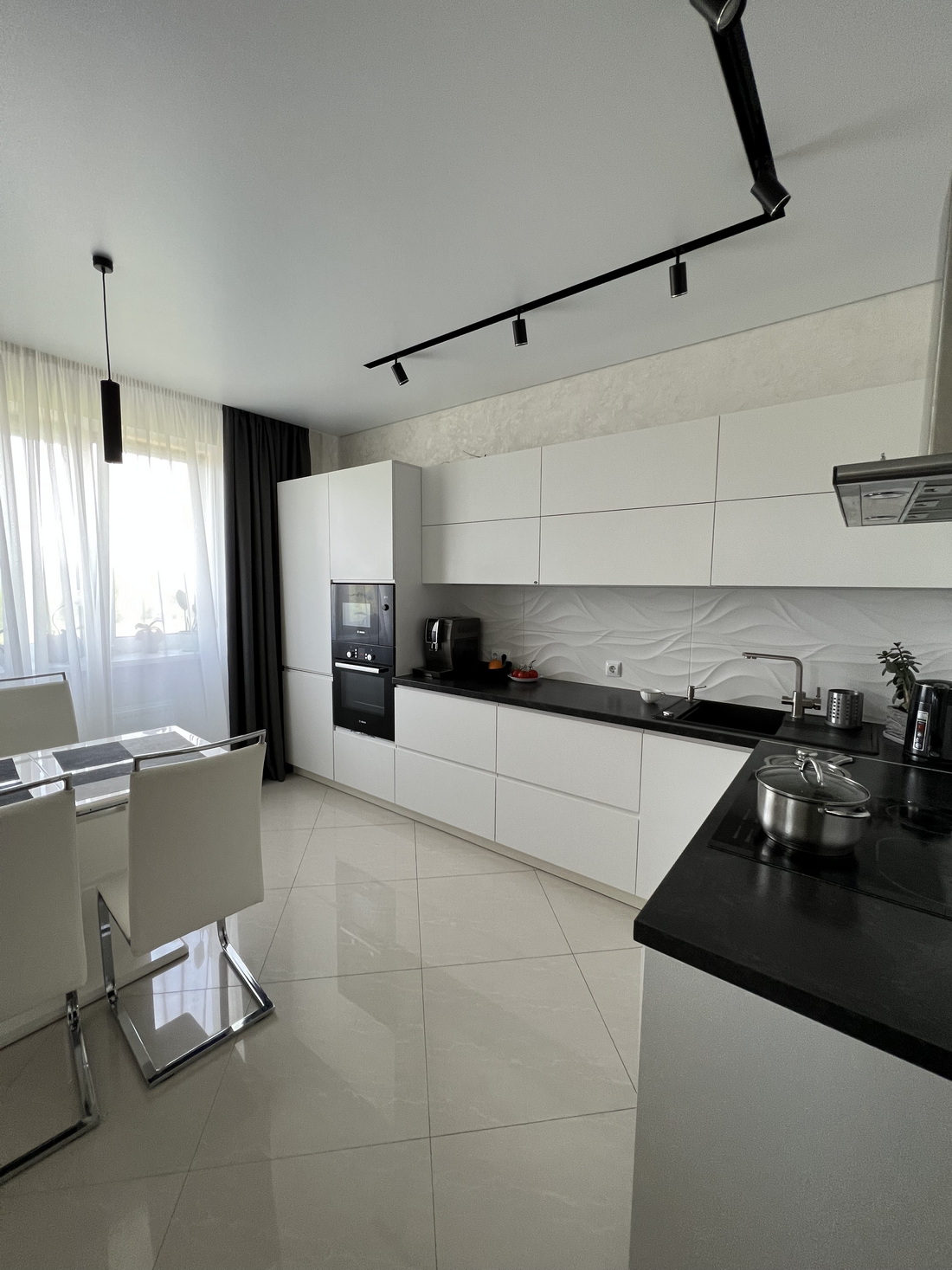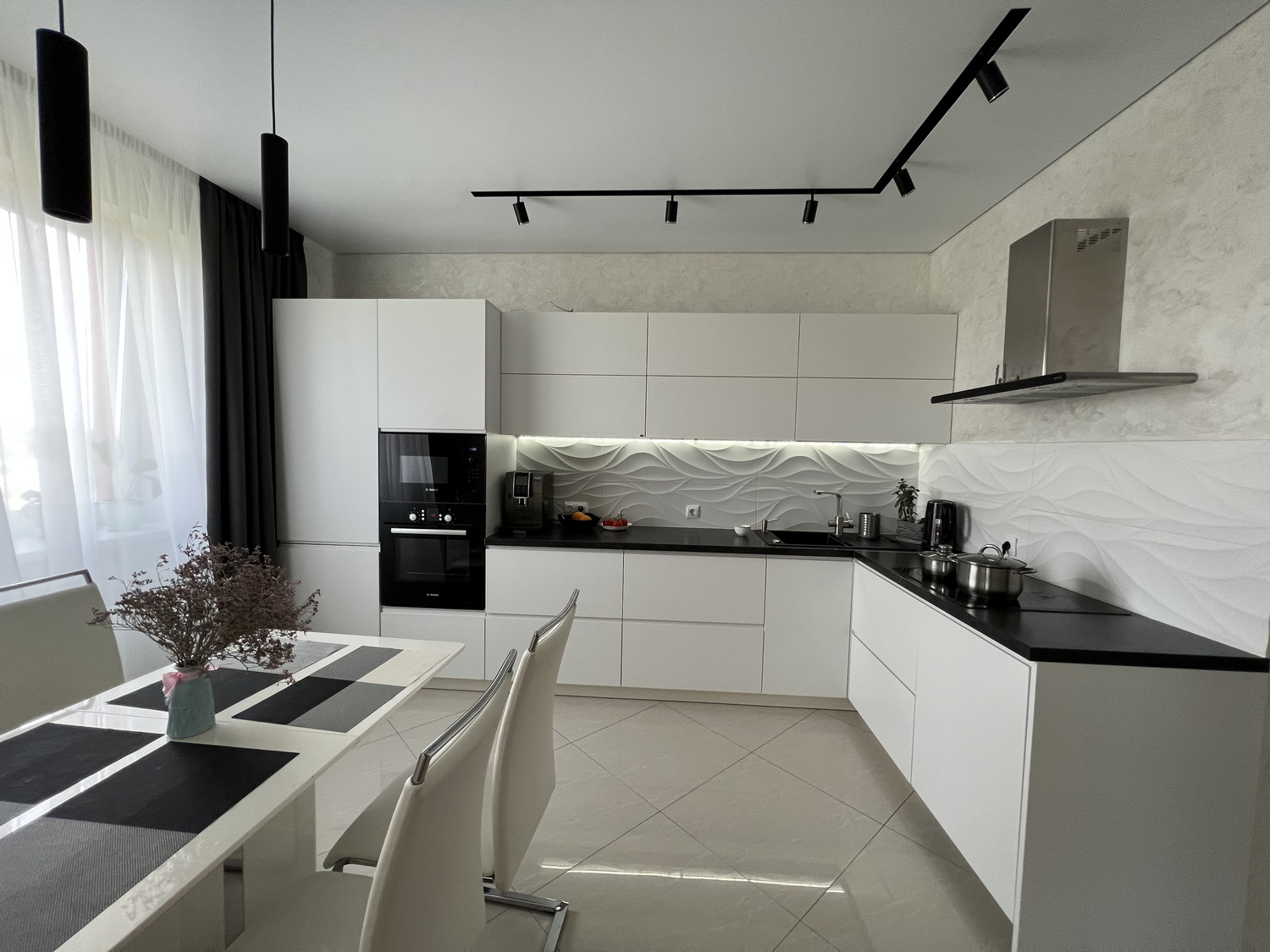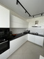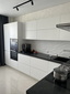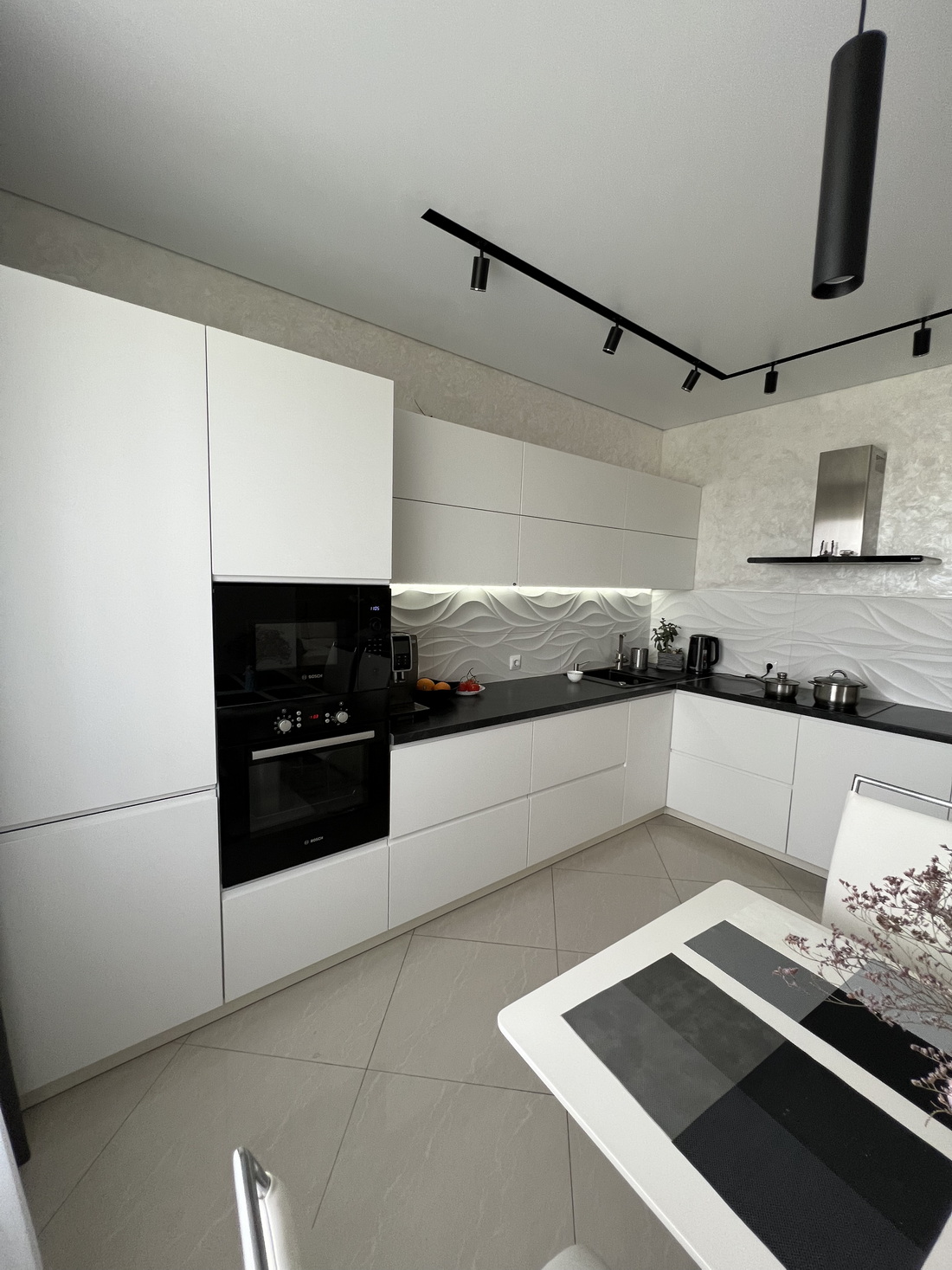 Белая угловая кухня без ручек с матовыми фасадами МДФ крашеный интегрированные ручки и открытой вытяжкой