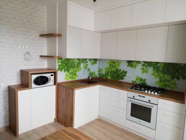 Верхние фасады со стеклом. Ширина кухни 150 см.