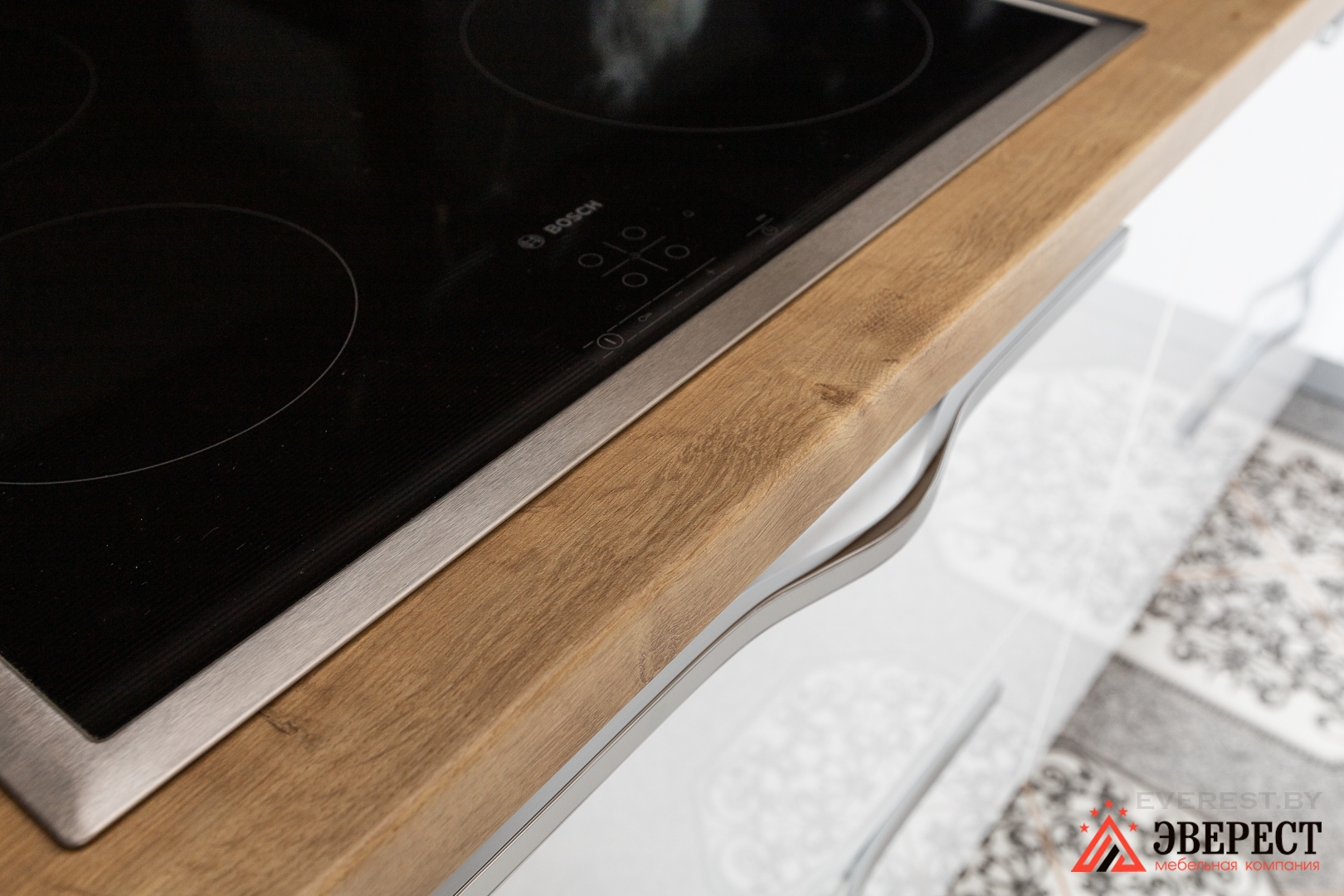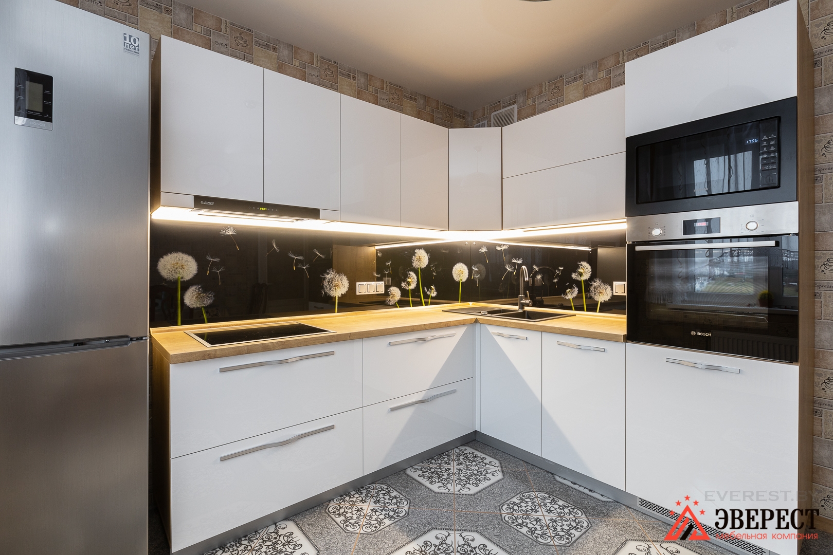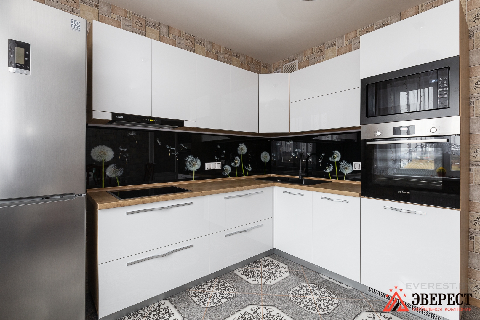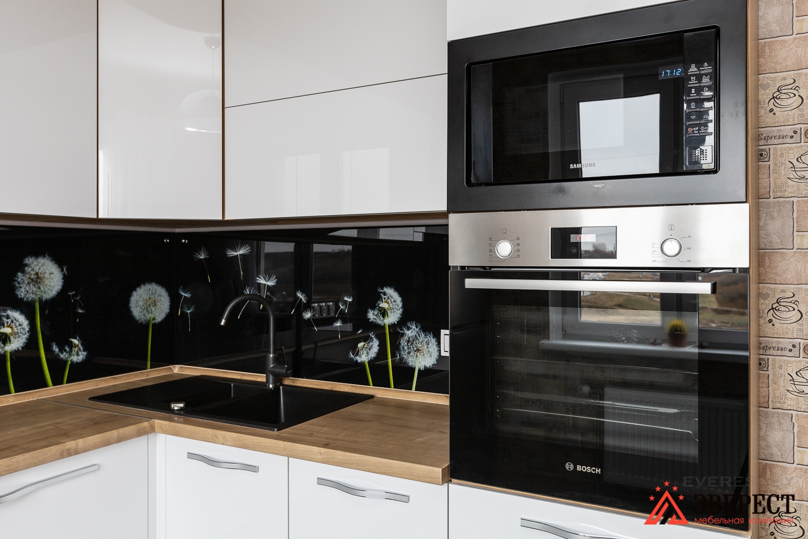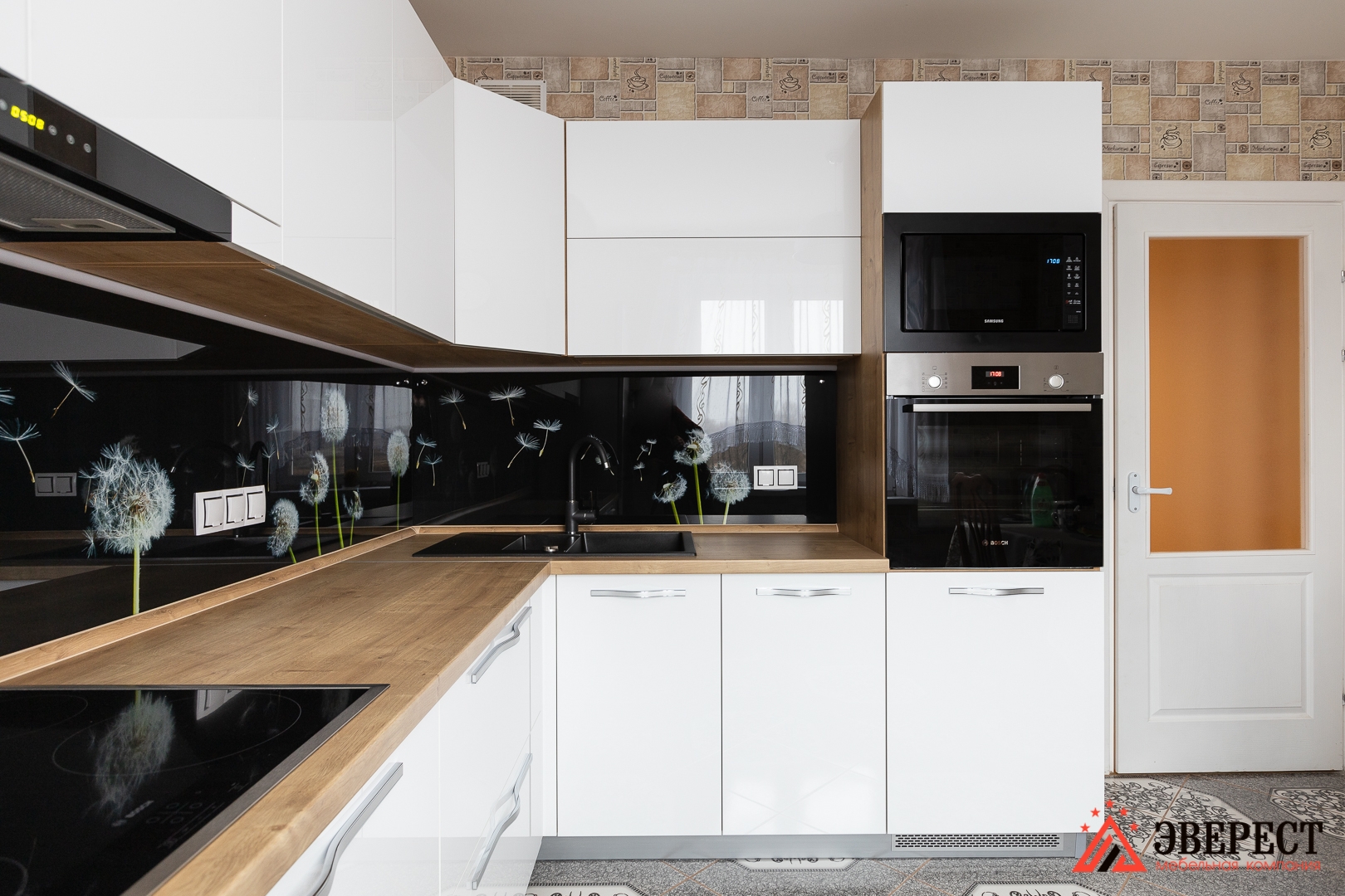 код 105775Кухонный гарнитур белого цвета с древесной столешницей. Ниши для техники. Подсветка.