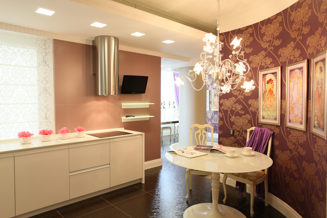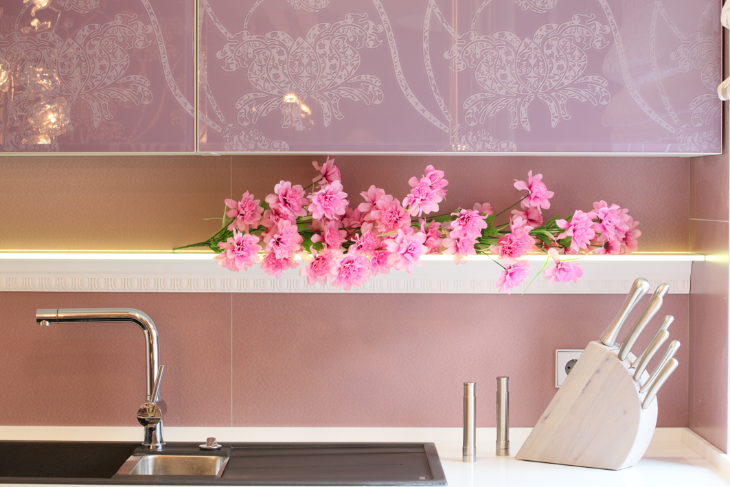 код 84695Чередование матовых и глянцевых фасадов. Навесной модуль с лиловым принтом.