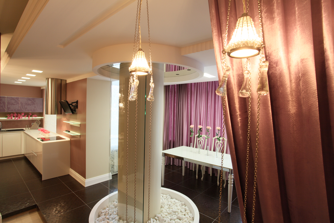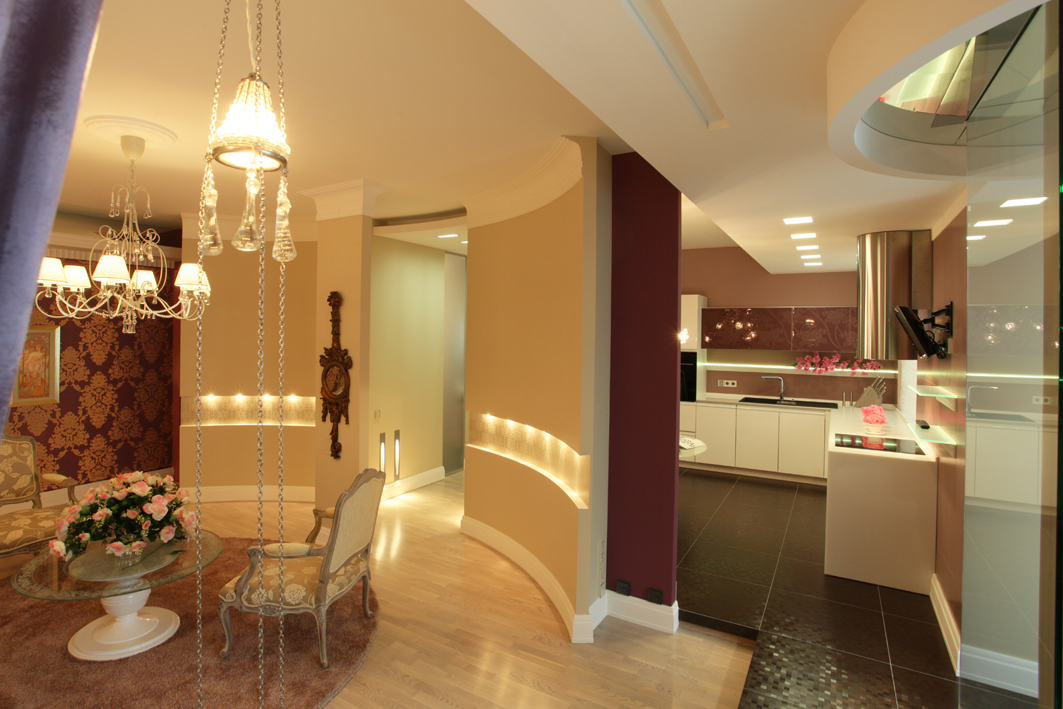 Глянцевые фасады без ручек, множество шкафчиков и ящиков, качественные материалы и фурнитура.