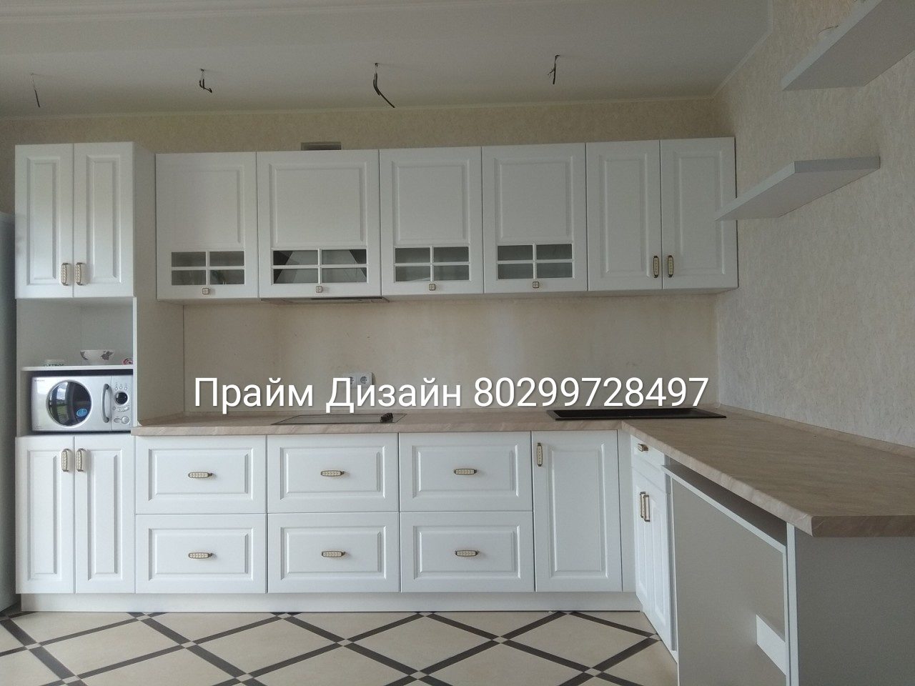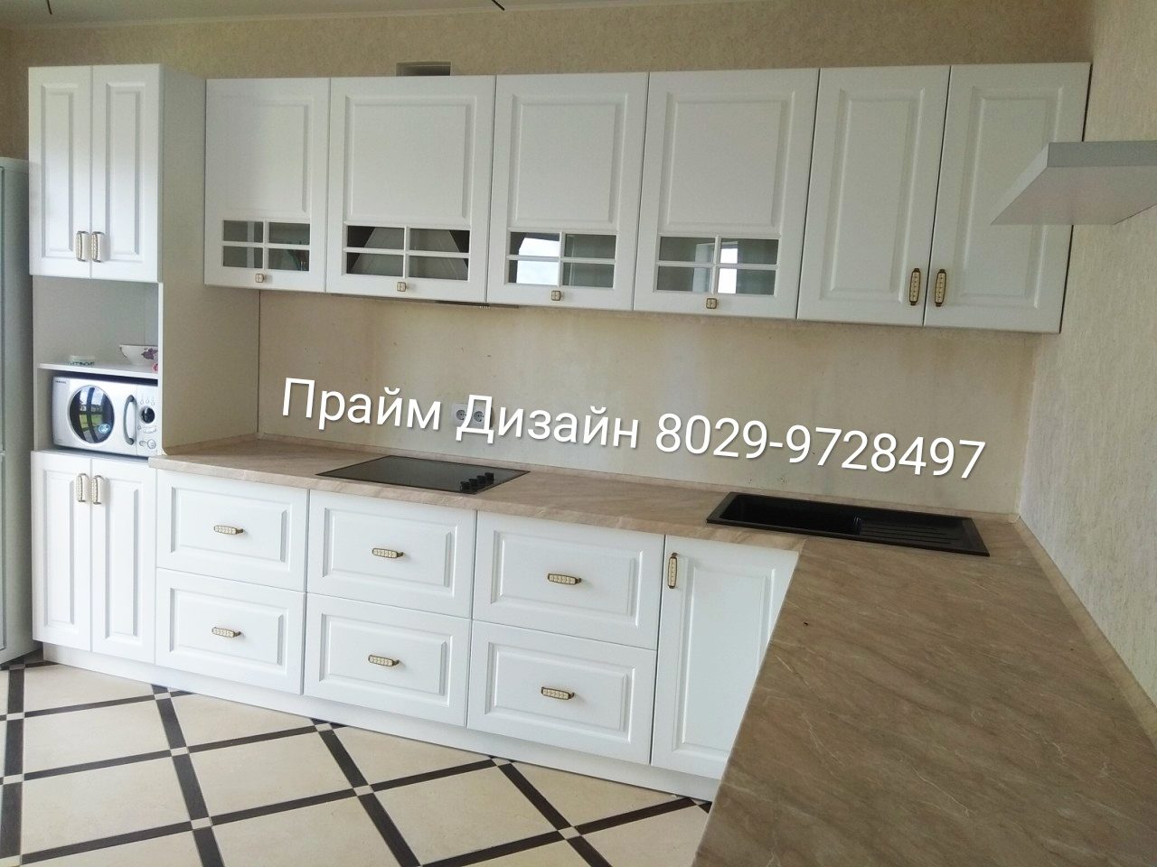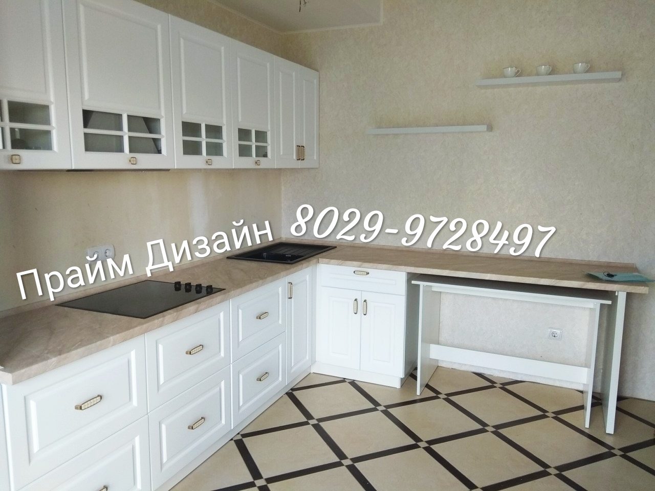 Угловая кухня в белом цвете с филенками. Оснащается навесными и напольными модулями с распашными шкафчиками и выдвижными ящиками. Лаконичный дизайн белого цвета позволяет визуально расширить пространство кухни. Просторная столешница отлично подходит для комфортной готовки.