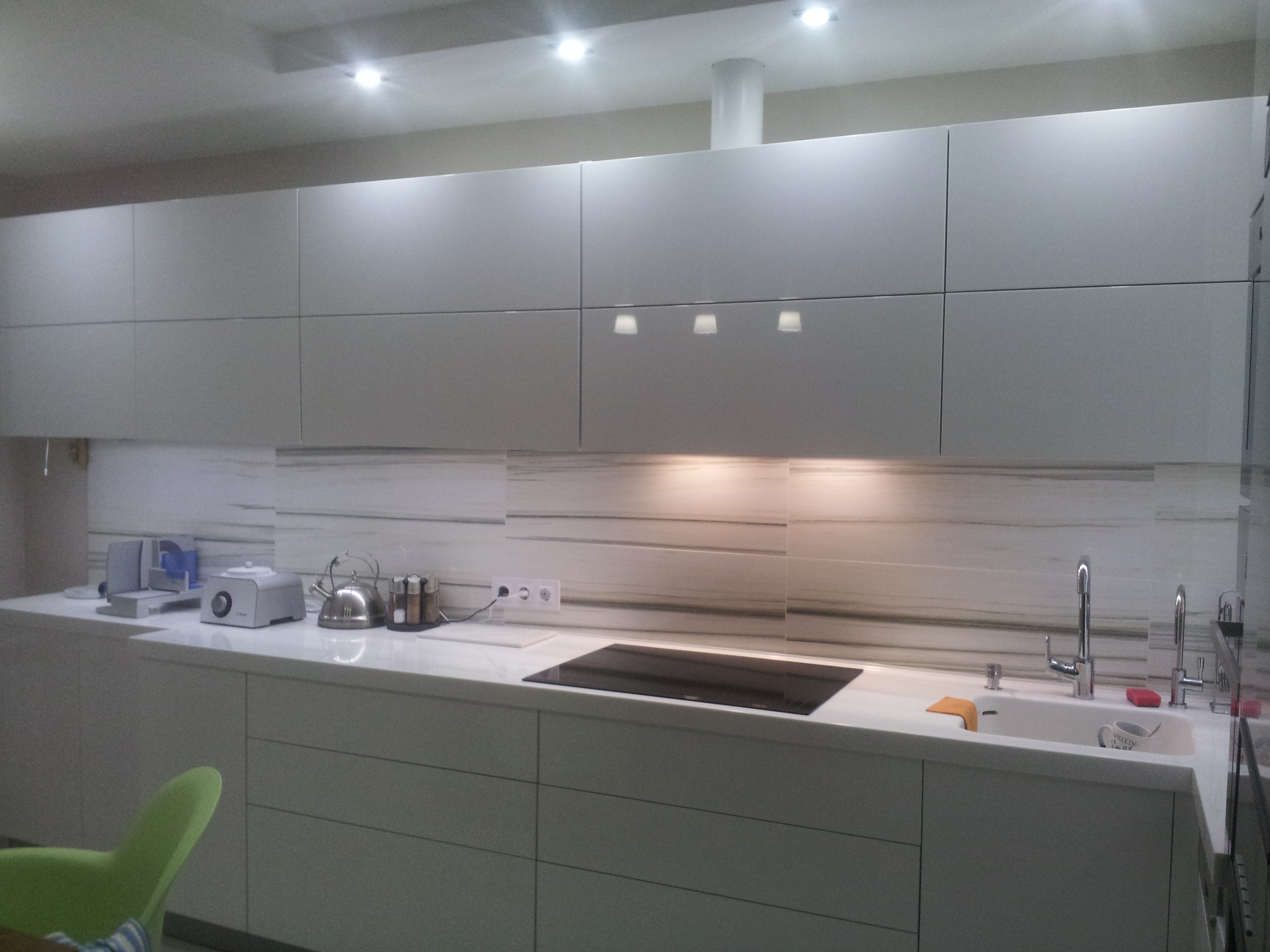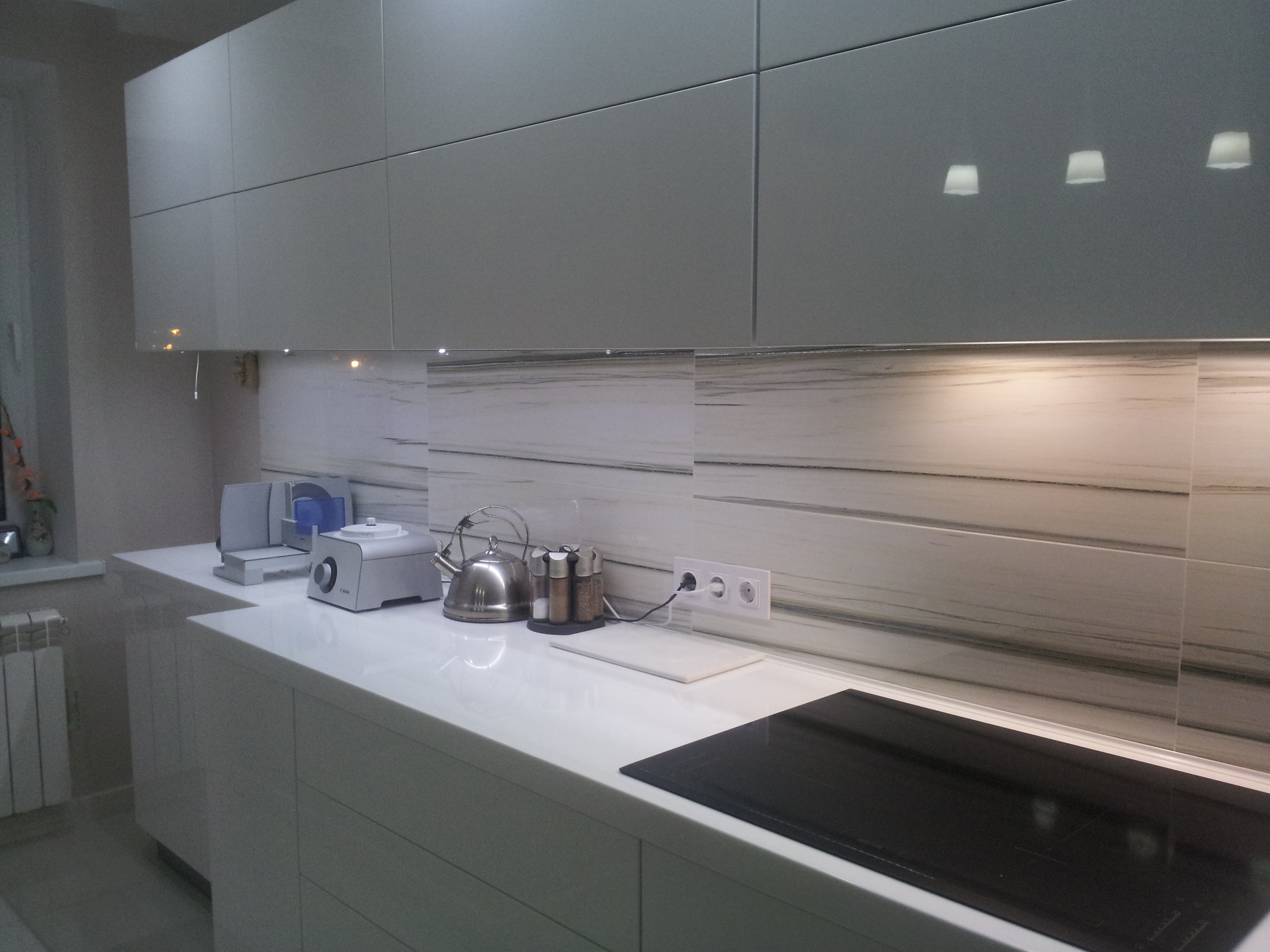 Стильная глянцевая кухня с фасадами без ручек. Дополняется витриной с подсветкой.
