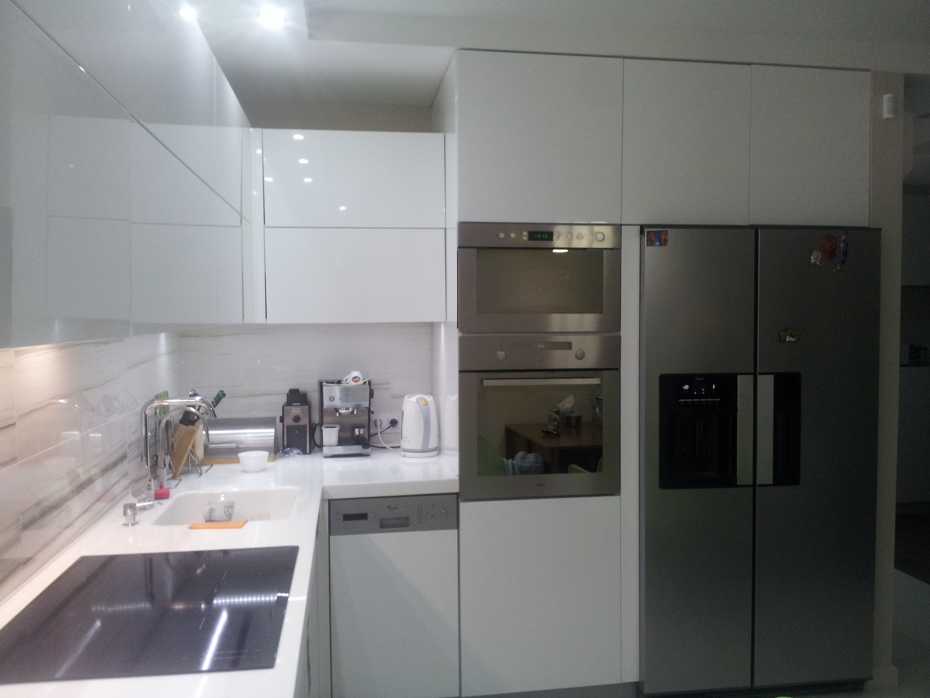 Современная угловая кухня с белыми глянцевыми фасадами без ручек