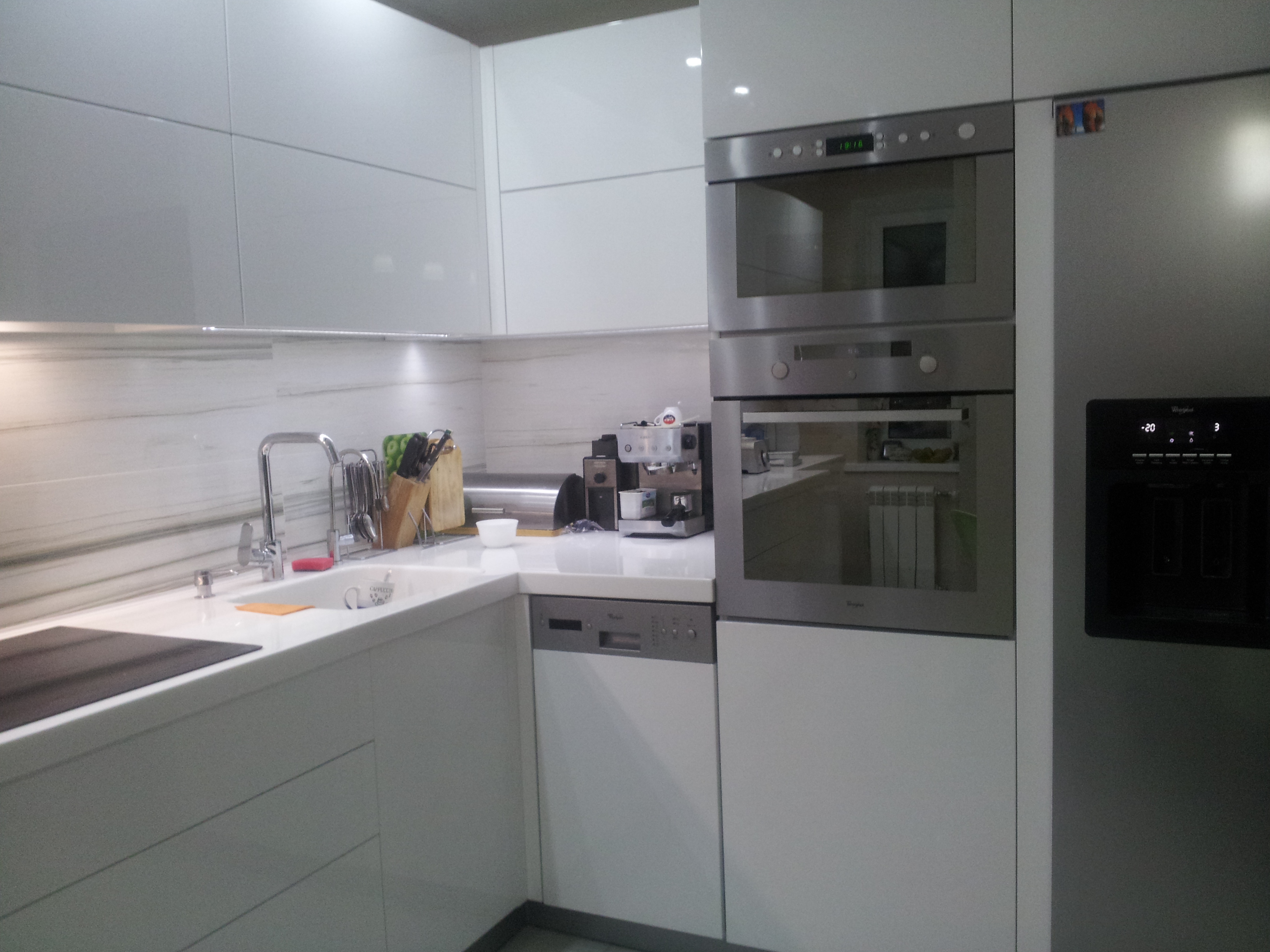 Отличительной чертой данной модели является отсутствие ручек и исполнение в белом цвете всех частей гарнитура, за счет чего кухня превращается из обычной мебели в абсолютный монолит, слившийся воедино со всем интерьером. Конструкция угловая и имеет многочисленные шкафы и ящики,а также ниши для многочисленной встраиваемой техники.