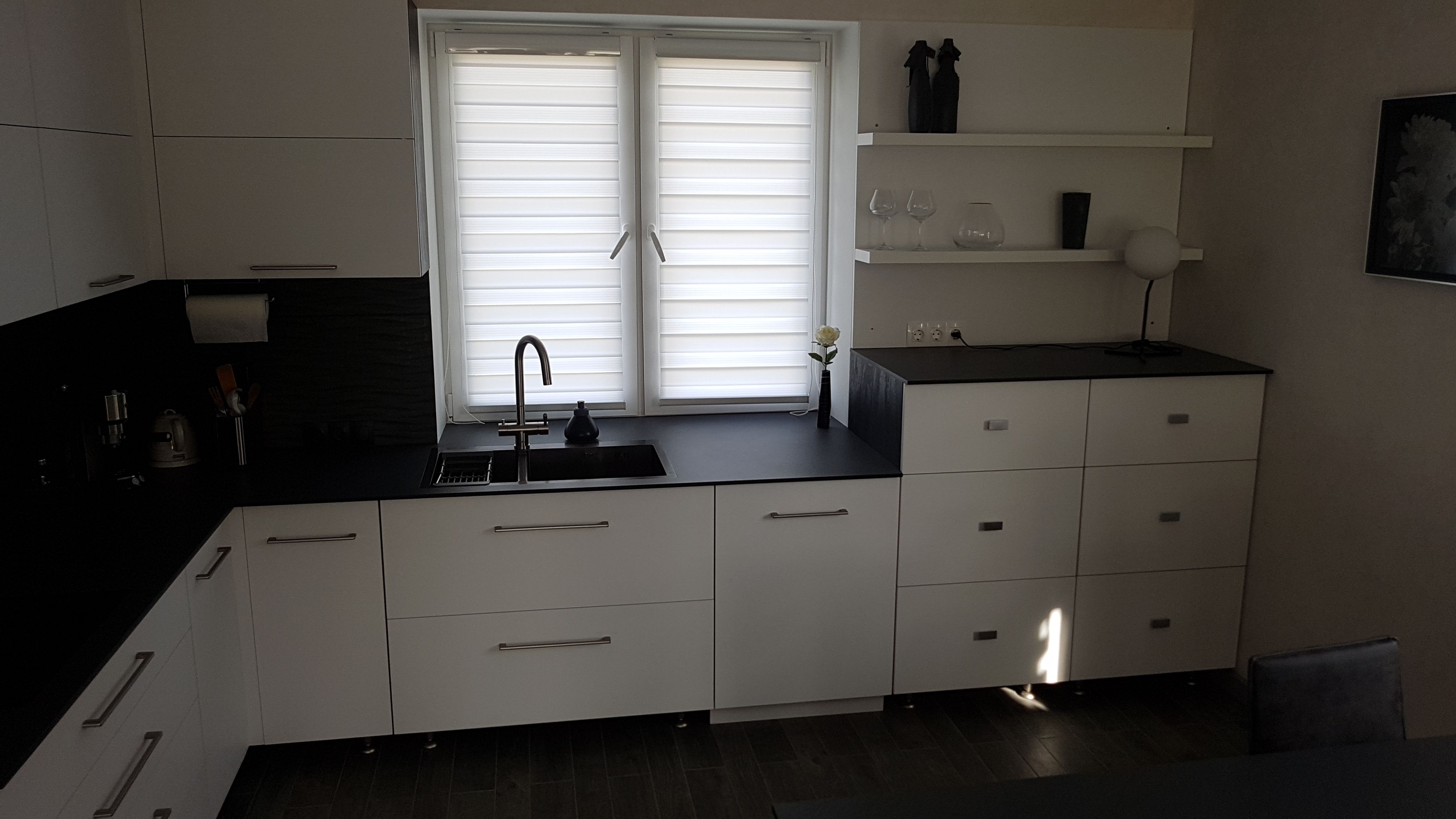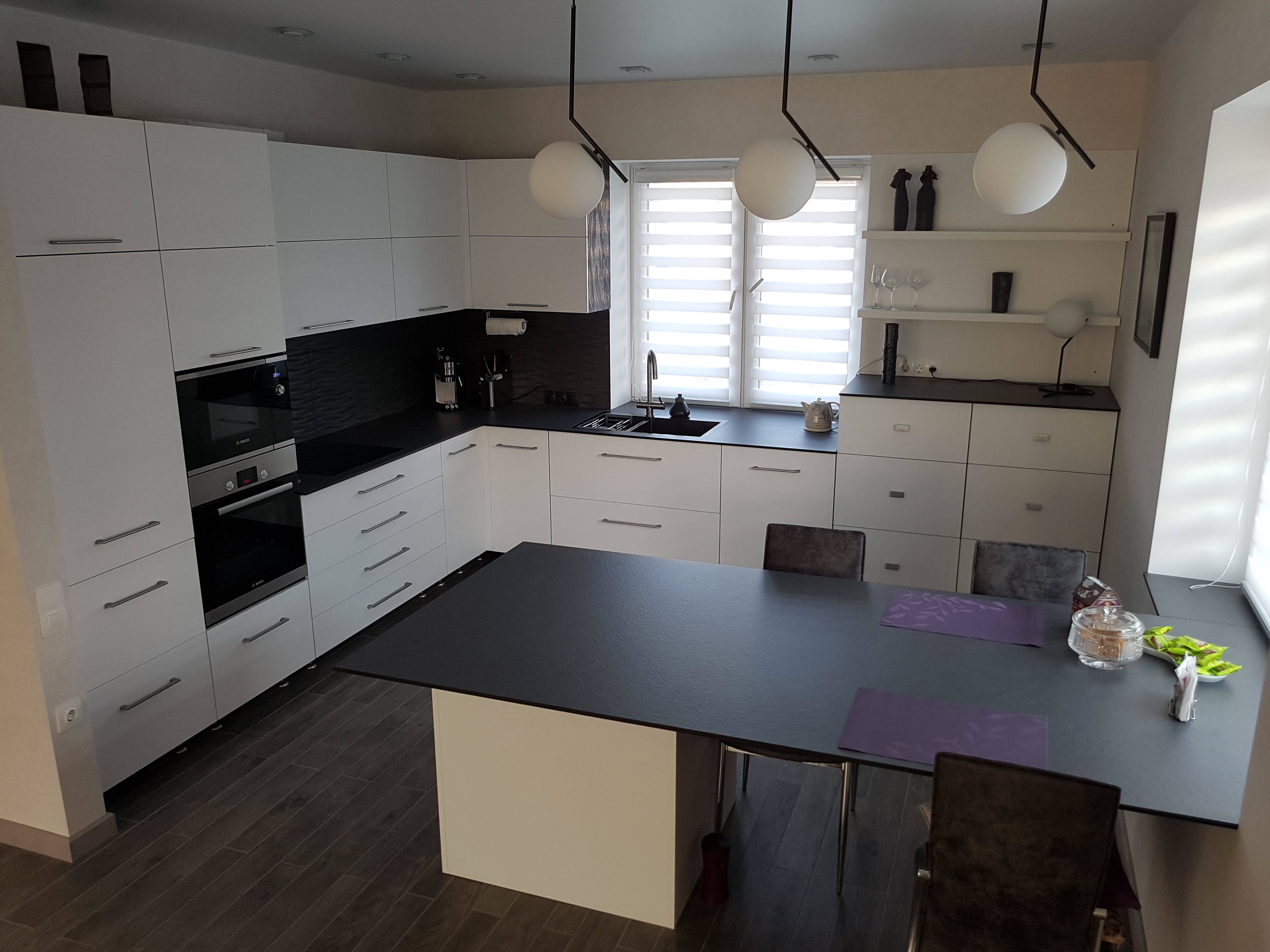 Угловая белая кухня с черной столешницей и обеденной зоной