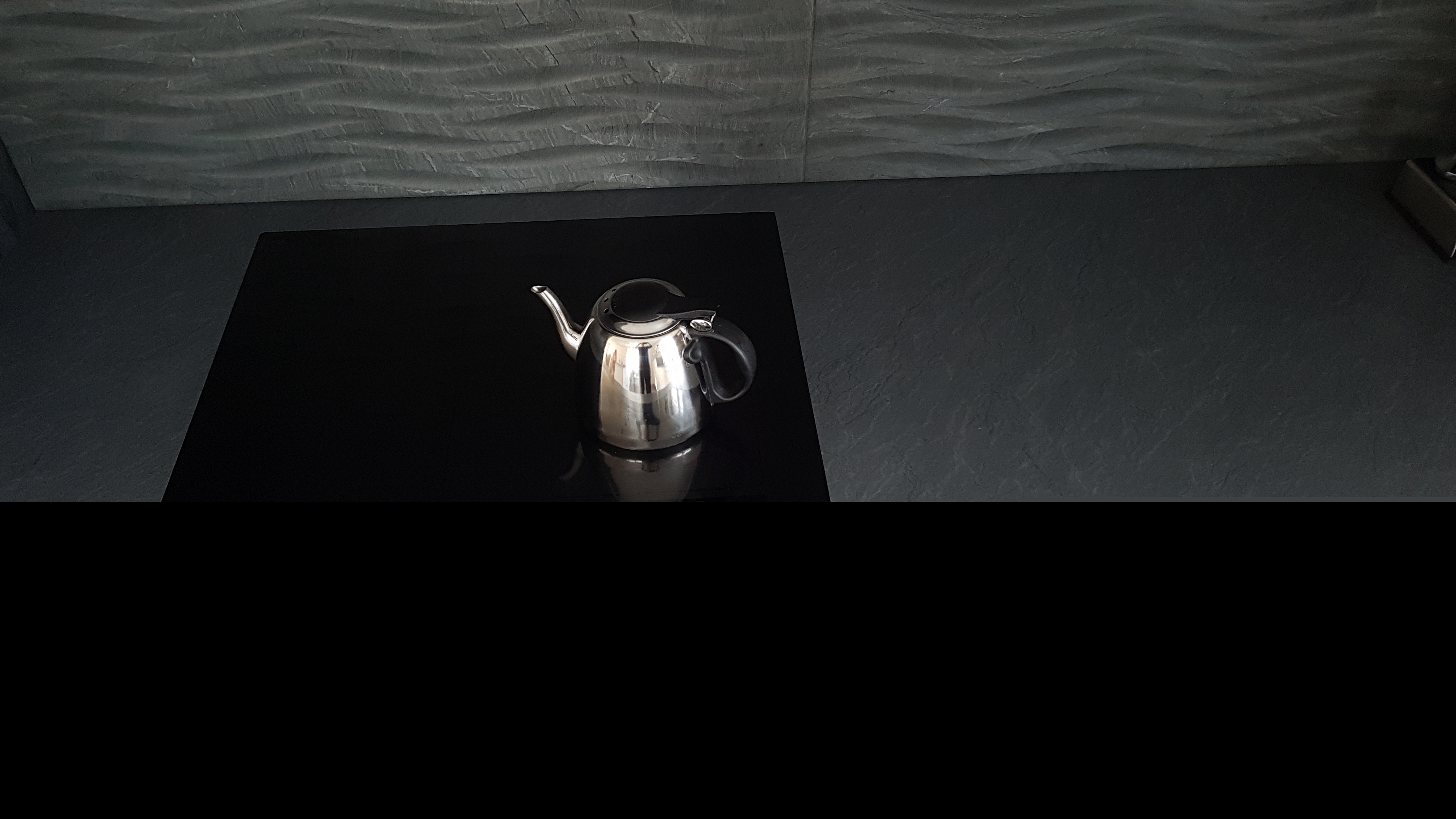 Угловая серая кухня в стиле лофт с темной столешницей