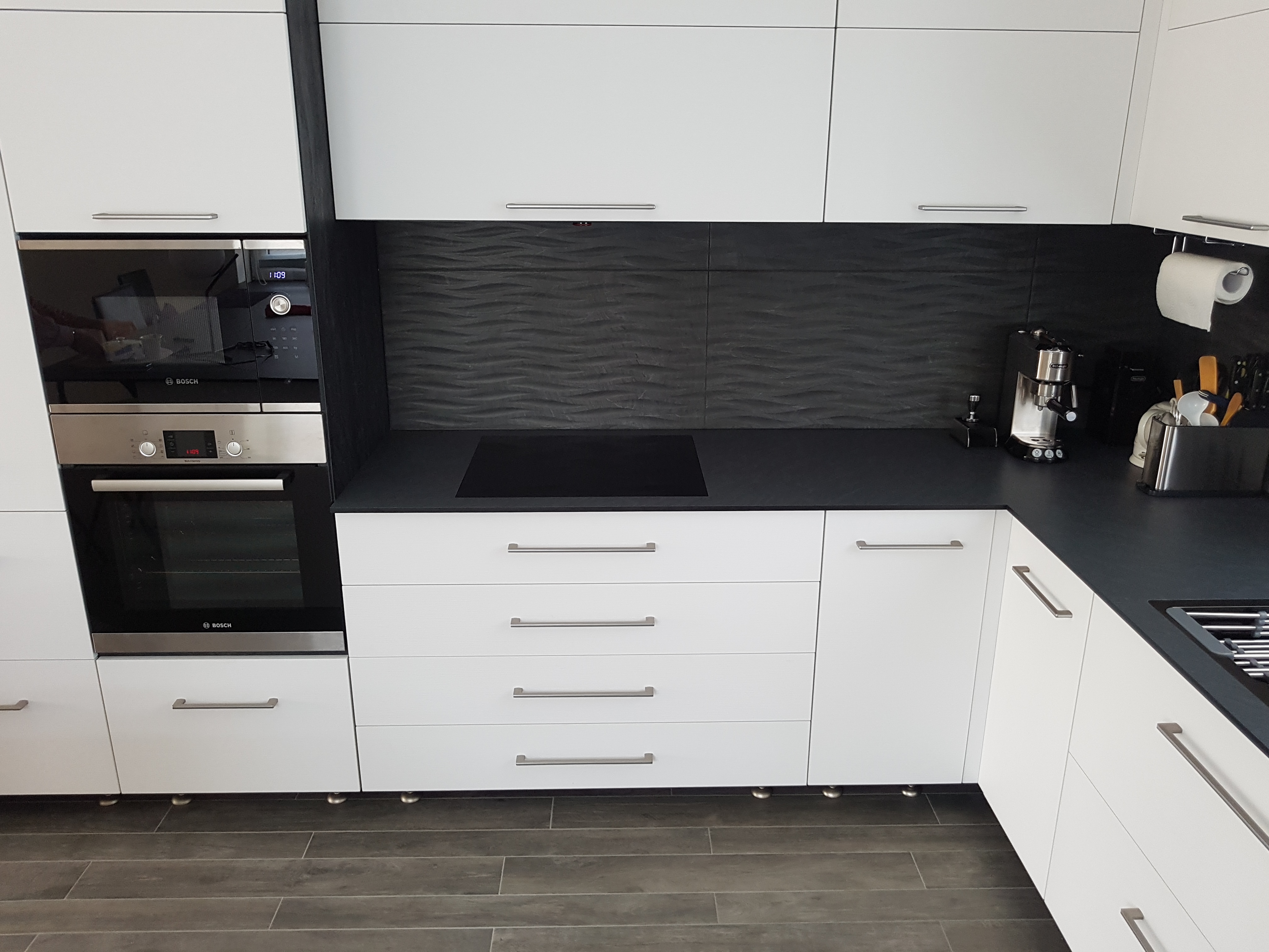 Фасады без ручек. Столешница и фартук в едином стиле. Удобное рабочее пространство.
