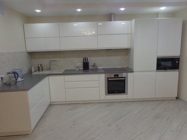 Комбинированные фасады, интегрированные ручки, механизм открывания нажатием.