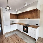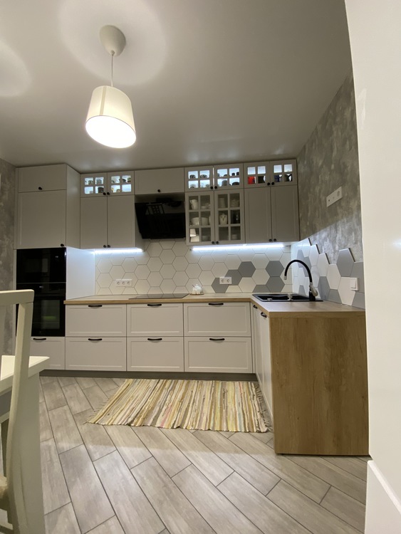 Отделка фасадов в двух цветах. Ширина кухни 160 см.